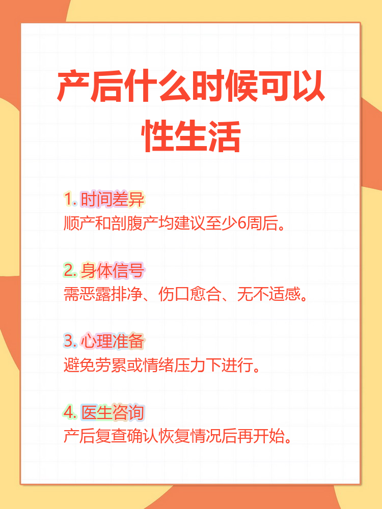 产妇一般可在产后6周复查没问题后进行性生活,但具体时间因生产方式和个人体质而异具体分析如下自然分娩且恢复良好的产妇生殖器官恢复通常需要约6周时间,产褥期为42天,这是子宫等盆底器官的恢复期若产后42天复查时医生确认身体无异常,理论上可恢复性生活但需以医生评估为准,避免自行判断剖;剖宫产之后的第42天,母婴都应该进行一次全面的检查,如果说检查正常的话就可以恢复夫妻生活了,但是一定要注意动作的轻柔,不可以太过剧烈,如果过早地开始性生活会严重影响到子宫的恢复,容易引发感染,进一步导致阴道炎盆腔炎子宫内膜炎等妇科疾病,而且产后的恢复每个人都不一样,如果本身体质就比较。