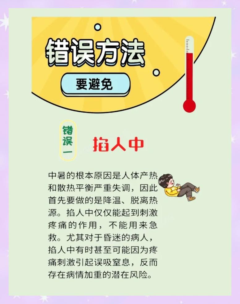 预防中暑的方法如下避免高温环境尽量减少在炎热天气中长时间暴露于高温环境,尤其是中午至下午时段若必须外出,应选择阴凉通风的场所活动,并佩戴宽边遮阳帽太阳镜及防晒用品,减少阳光直射对头部的直接加热穿着合适衣物选择轻薄透气的天然纤维衣物如棉麻,颜色以浅色为主,可反射阳光。