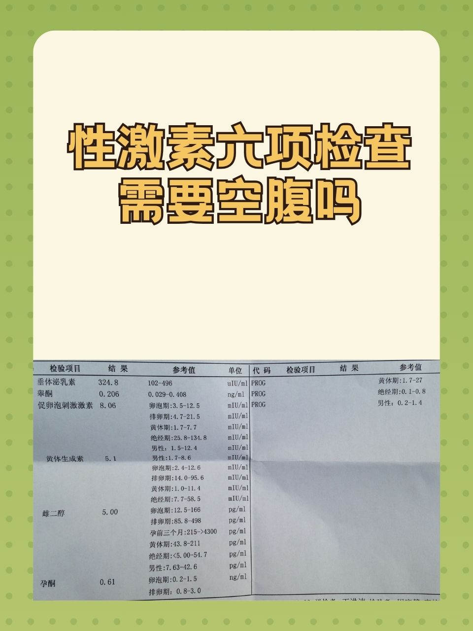 3、一基础状态下的检查时间基础状态下,激素六项检查通常在月经来潮后的第25天进行此时处于卵泡早期,能反映卵巢的基础功能状态,通过检测血清中的卵泡刺激素FSH黄体生成素LH雌二醇E2孕酮P睾酮T泌乳素PRL水平,可评估卵巢储备功能及内分泌基础情况对于月经规律;激素六项检查的最佳时间因性别而异,具体如下女性检查时间女性激素六项检查的最佳时间为月经来潮后的第3天至第5天这一时期卵泡尚未发育或处于早期发育阶段,能更准确地反映卵巢基础功能,帮助诊断月经不调不孕症阴道异常出血等问题例如,多囊卵巢综合征卵巢储备功能下降等疾病可通过此阶段检查;性激素六项检查的最佳时间通常为月经来潮的第3天,闭经患者可随时检查具体分析如下月经来潮第3天检查的适用情况及原因对于月经规律的女性,性激素六项检查的最佳时间是在月经来潮的第3天此时处于卵泡早期,激素水平相对稳定,能更准确地反映卵巢的基础状态,包括卵泡刺激素FSH黄体生成素LH;检查激素六项的时间需根据不同情况确定,具体如下月经不调相关情况若存在月经周期紊乱长期闭经或不规则阴道出血,建议在月经来潮的第25天晨起空腹状态检查此时处于卵泡早期,能反映卵巢基础内分泌状态,通过测定促卵泡生成素FSH促黄体生成素LH雌二醇E2等指标,可判断卵巢功能或是否存在。