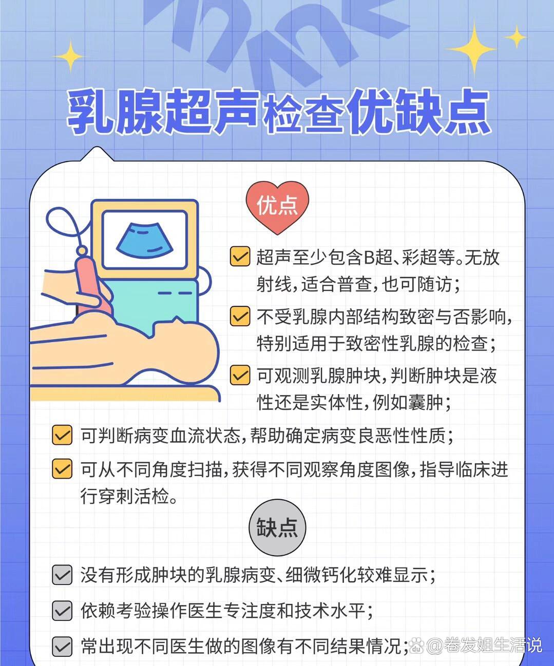 查乳腺可做的检查项目及相关建议如下乳腺超声检查利用超声波对乳腺组织成像,可清晰显示腺体导管及肿块等结构优势在于分辨率高无辐射操作简便,适合全年龄段女性,尤其年轻女性因乳腺组织致密,超声是常用筛查手段适用情况包括评估肿块性质如囊性表现为无回声区,实性为低回声区观察腋窝。