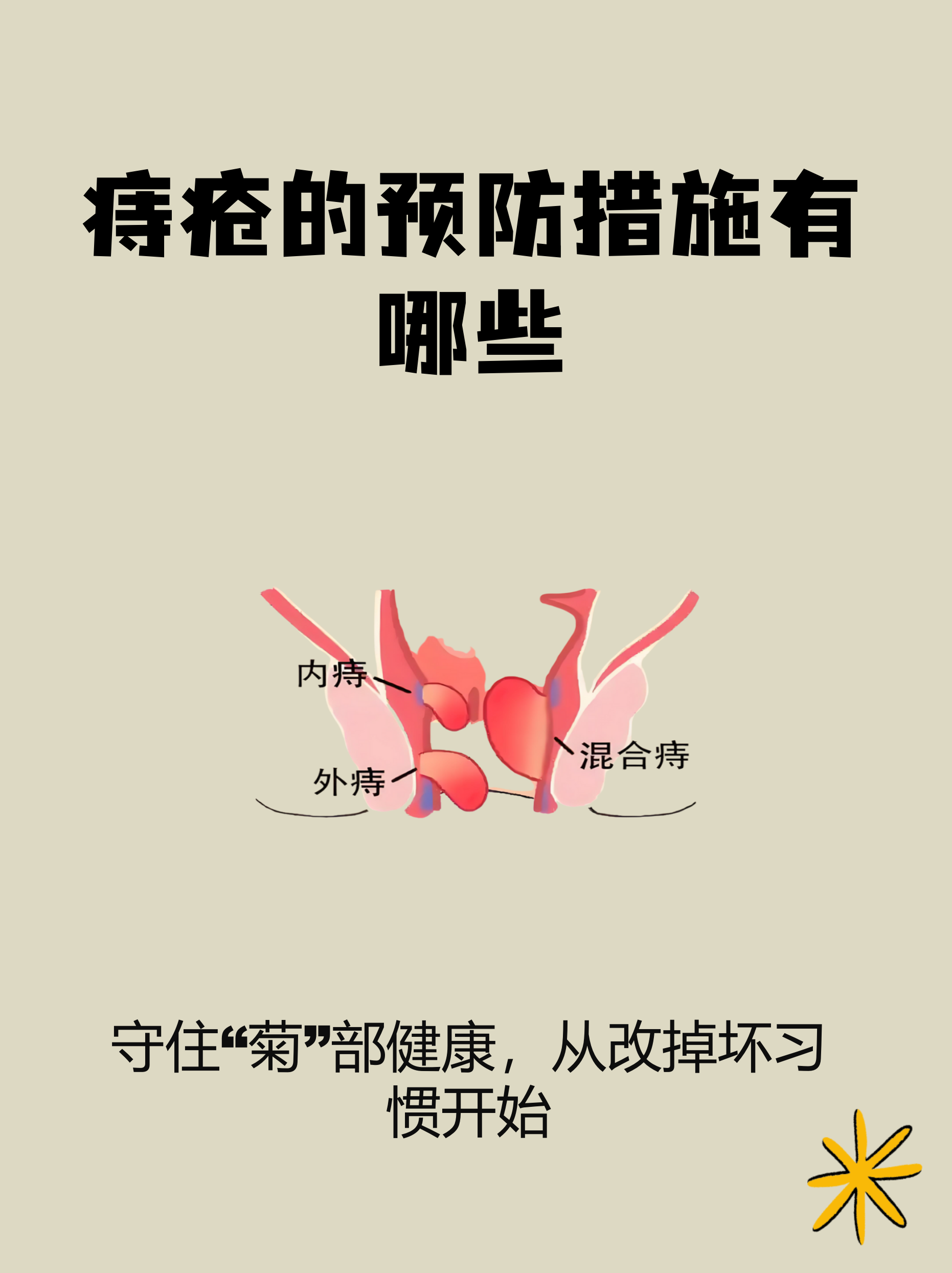 13、预防痔疮的方法生活习惯方面避免久坐久站长时间保持一种姿势会使直肠静脉丛血液淤积,增加痔疮风险工作中要定时起身活动,比如坐或站4560分钟,就活动510分钟规律排便每天尽量固定时间排便,如早上起床后或饭后半小时,有助于养成良好的排便反射每次排便时间最好控制在35分钟,避免长时间。