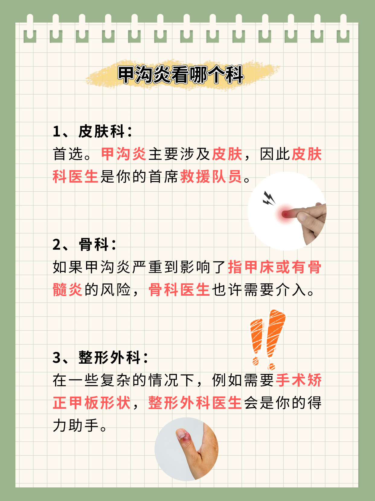 14、一般来说,甲沟炎可挂皮肤科外科或甲病科若医院科室设置较为常规,皮肤科和外科是主要就诊科室皮肤科医生擅长处理皮肤及皮下组织感染问题,甲沟炎的炎症表现如红肿疼痛化脓属于其诊疗范围外科则可处理需要切开引流或拔甲的严重病例若医院设有更细分的专科,甲病科是更精准的选择该科室。