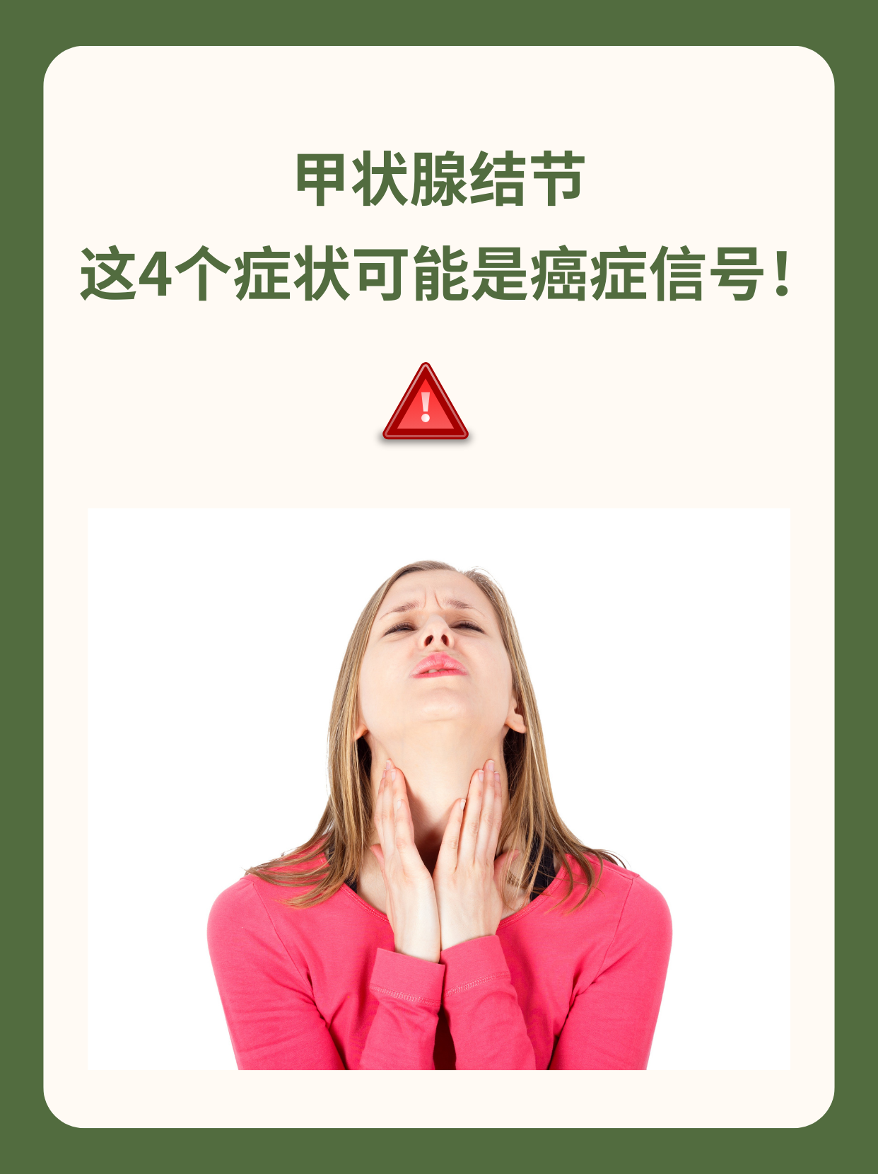 体检发现甲状腺结节后需要引起重视,因为甲状腺结节可能会不断发展而导致甲状腺癌出现在癌变之后,局部的肿块体积会增大刚开始出现的是小的肿块或结节,但性质改变后癌细胞产生随着甲状腺癌不断发展,癌细胞越来越多,局部的肿块或结节体积会明显变大,进而出现压迫或继发性症状这种情况的出现代表疾病。