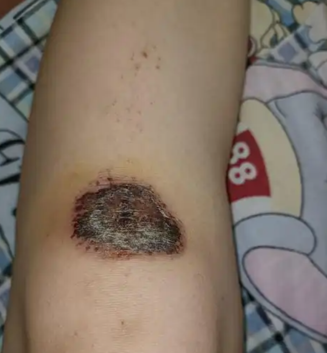 不用处理它等它结痂了自然会掉下来,还有就是你不要用纱布蒙着这样容易发炎的,你可以去买瓶百多邦擦一下这样不容易发炎,这是经验之谈,希望能够帮助到您望采纳。