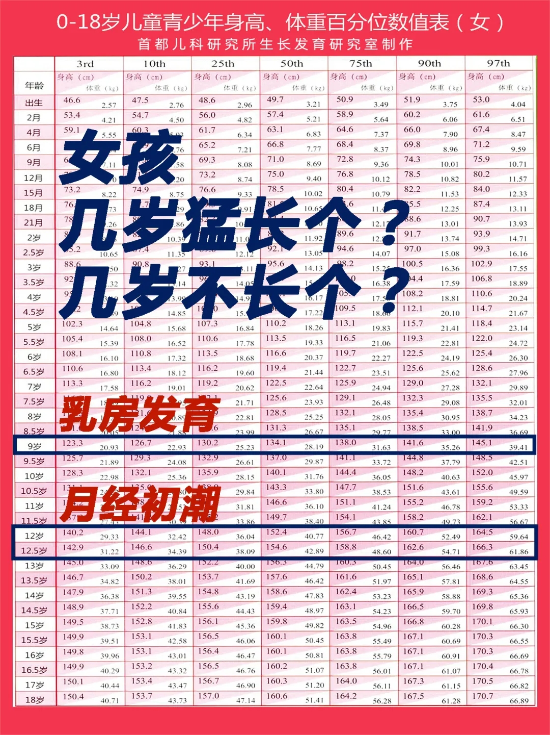 5 从青春期开始到生长停止,通常持续6到7年,这段时间的身高增长约占最终身高的15%6 在这个时期内,约34的身高增长发生在月经初潮之前,而剩余的14发生在月经初潮之后7 大约在13岁时,女孩的身高增长基本停滞,达到了最终身高的95%8 相比之下,男孩的生长加速开始年龄通常比女孩晚。