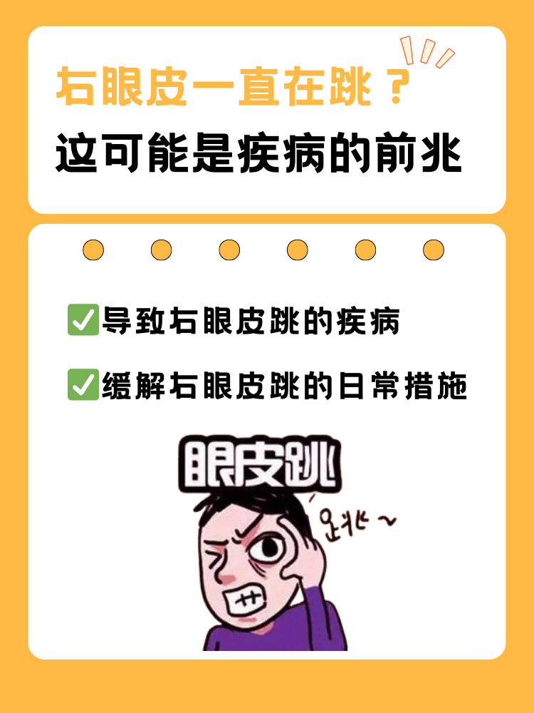 右眼的下眼皮跳即眼睑痉挛,可能与以下多种原因有关一常见诱因 疲劳或压力长时间用眼如看电脑手机睡眠不足会导致眼部肌肉紧张,引发痉挛建议每小时休息510分钟,通过热敷或按摩缓解缺乏睡眠睡眠质量差或时长不足可能干扰神经系统功能,导致眼睑不自主抽动需保持规律作息,营造安静;右眼下眼皮跳并无特定预兆,多与生理或病理因素相关生理性原因疲劳或压力长时间用眼如盯着电脑手机屏幕睡眠不足会导致眼部肌肉疲劳,引发眼皮跳动缺乏睡眠睡眠质量差或时长不足可能影响神经系统功能,间接导致眼皮跳动情绪紧张或焦虑压力过大会引发自主神经功能紊乱,进而影响眼部肌肉;右眼下眼皮跳可能由多种原因引起,具体如下眼部疲劳长时间使用电子设备阅读或熬夜等,会使眼睛长时间处于紧张状态,眼轮匝肌持续收缩,从而引发右眼下眼皮跳中老年人眼睛调节能力下降,更容易因疲劳出现眼皮跳长期不规律作息过度用眼或有屈光不正病史的人,眼皮跳的情况也可能更频繁此时应;右眼下眼皮跳可能是由多种因素引起,具体如下1疲劳或压力长时间用眼熬夜过度劳累或处于紧张状态时,眼部肌肉可能因疲劳而出现不自主收缩,导致眼皮跳动建议保持充足睡眠,避免连续用眼超过1小时,定期通过冥想深呼吸或眼部保健操放松2缺乏维生素或矿物质维生素B12钙镁等营养素的缺乏可能。