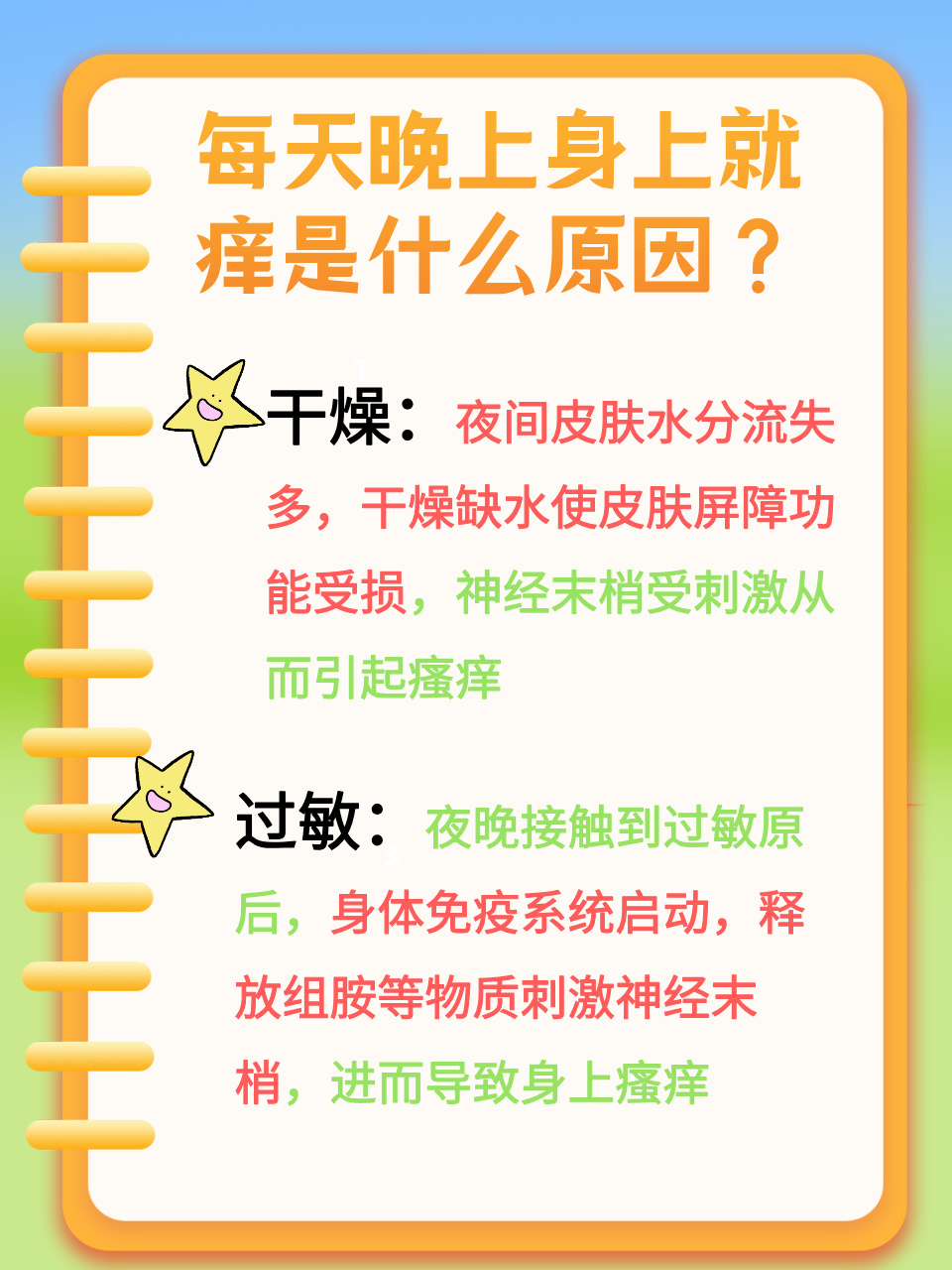 1 全身瘙痒警惕过敏 全身瘙痒可能是过敏引起的,常见的过敏原包括对饮食花粉尘螨化学制剂等,而这种过敏以前你的饿全身痒一般在停止接触过敏原后好转怎么办 1保持皮肤清洁春天多风沙,这些灰尘与分泌旺盛的皮脂相混合,易造成皮肤粗糙,故应时刻保持皮肤清洁,可用温和的洗面奶及柔肤。
