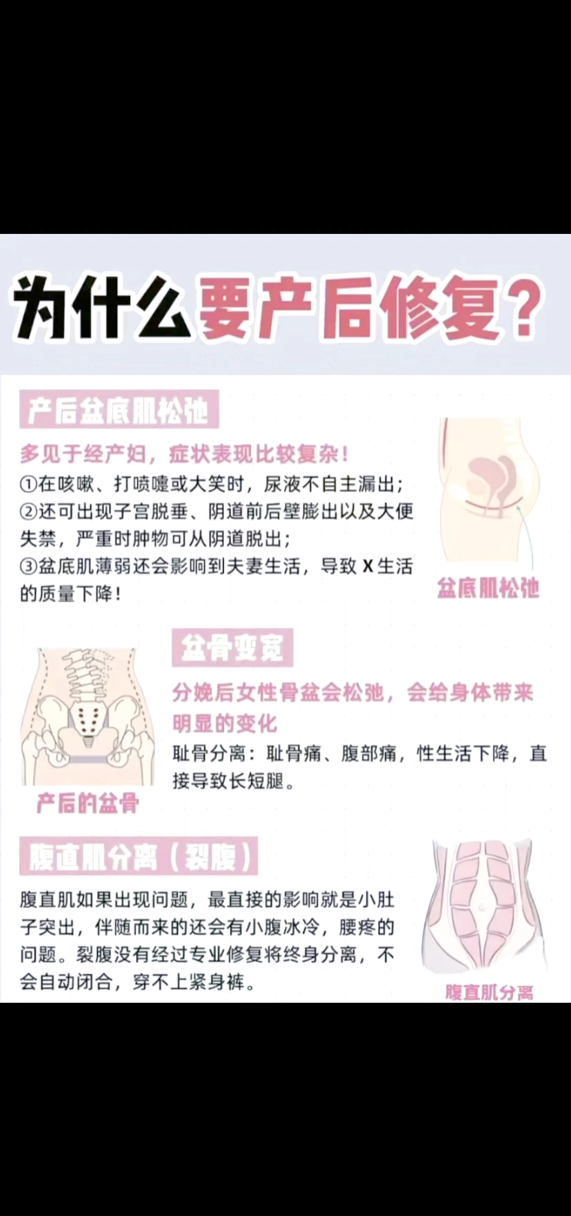 腹部肌肉训练如腹式呼吸平板支撑等,可恢复腹部肌肉紧致度,减少松弛和赘肉产后6个月后1年内此阶段仍属康复重要期,但恢复速度逐渐减缓推荐项目包括延续有氧运动与盆底肌训练保持基础代谢,巩固盆底功能增加力量训练如举重俯卧撑等,增强全身肌肉力量,改善体态腹部综合训练结合按摩;产后必做的修复项目包括子宫复旧乳腺疏通维秘美胸满月汗蒸盆底肌修复腹直肌修复及骨盆修复具体如下子宫复旧康复部位子宫解决的问题腹痛恶露不止原因子宫需46周恢复至接近非孕状态,期间盆腔感染子宫肌瘤多次妊娠等因素会影响恢复,导致子宫复旧不良,引发腹痛恶露不绝;产后康复涵盖多个重要项目,具体如下一盆底肌修复怀孕与分娩易导致盆底肌损伤,引发尿失禁子宫脱垂等功能障碍修复方法包括凯格尔运动自主收缩与放松盆底肌和医院康复治疗仪通过电刺激与生物反馈增强肌肉力量研究显示,50%60%的经产妇存在盆底功能障碍,修复可显著改善症状二子宫复旧。