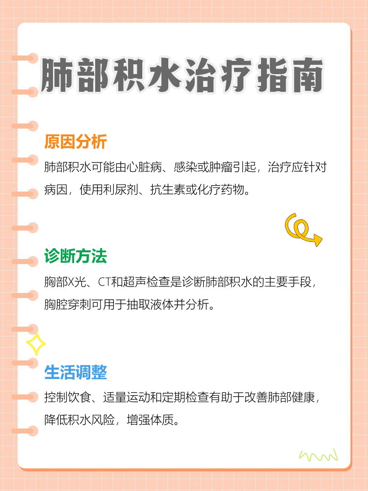 1 病因治疗根据肺积水的具体病因进行干预例如,若由肺炎引发,需使用抗生素控制感染若因心力衰竭导致,需通过利尿剂减轻心脏负担若为结核性胸膜炎,则需抗结核治疗针对病因的精准治疗是控制病情的关键2 胸腔穿刺抽液当肺积水较多且压迫肺部,引发呼吸困难胸痛等症状时,可通过胸腔穿刺抽液快;日常护理与饮食调整卧床休息肺积水患者平时需要卧床休息,这有助于肾脏和肝脏的恢复,从而对肺积水的治疗产生积极影响饮食调整在饮食上,建议肺积水患者避免食用油炸烧烤烟熏以及酒类等刺激性食物相反,应多吃新鲜的水果和蔬菜,这些食物富含维生素和矿物质,有助于增强身体免疫力,促进病情恢复;肺炎对于肺炎引起的肺部积水,应积极进行抗感染治疗,选择合适的抗生素,如青霉素头孢菌素等,以消除肺部炎症,减少积水结核性胸膜炎如果考虑结核性胸膜炎引起的积水,应完善相关检查,明确诊断后给予抗结核治疗,如异烟肼利福平吡嗪酰胺等恶性肿瘤如果是由恶性肿瘤引起的恶性胸腔积液,应进行抗。