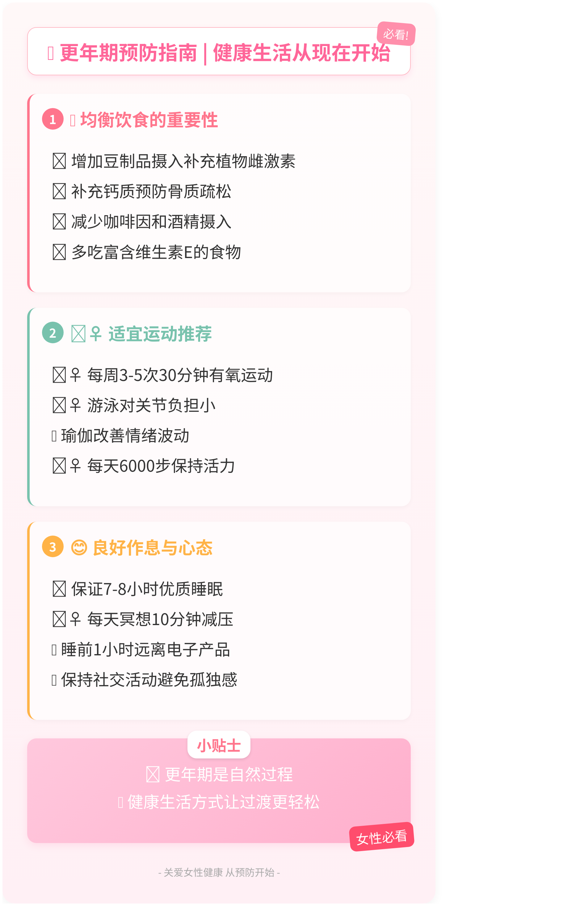 在现代社会,由于工作压力和多种因素的影响,许多女性在40岁左右便提前进入更年期更年期常伴随着脾气暴躁和月经紊乱等症状,给女性的生活带来诸多不便然而,通过合理的生活方式调整和饮食习惯,我们有望推迟更年期的到来首先,豆制品是推迟更年期的天然良药它们富含植物雌激素,能有效缓解心理压力,延缓。