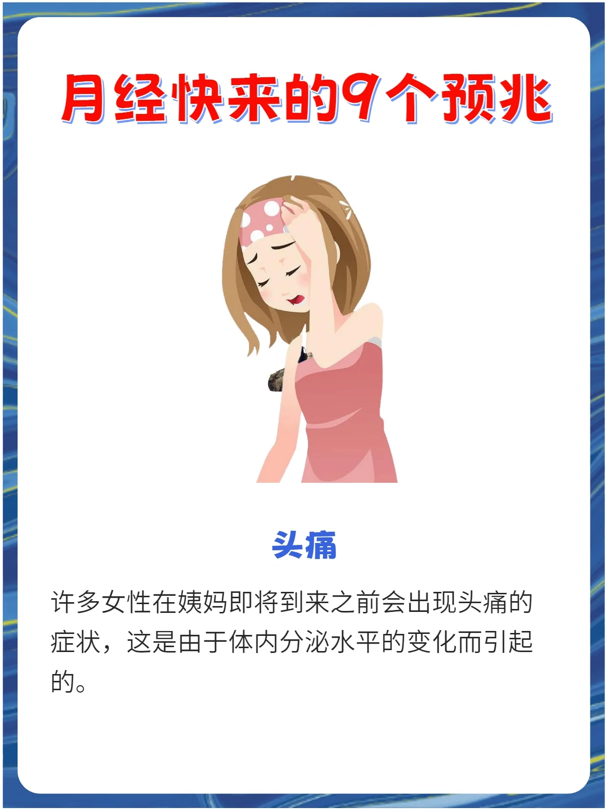 8、第一次来月经前,女性通常会出现以下征兆身体变化征兆乳房发育是月经初潮前最明显的生理信号乳腺组织在雌激素刺激下逐渐增生,表现为乳房体积增大,触摸时可能伴有轻微胀痛这一过程通常始于9~13岁,但受遗传营养等因素影响,个体发育时间存在差异生殖器变化紧随其后,外阴和阴道黏膜增厚,阴唇色素沉着加深,为月经来潮做准备这些变化与激素水。