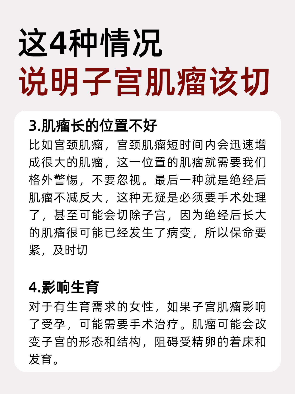 7、一般来说,患有子宫肌瘤妇女,肌瘤在直径4厘米以下,可以妊娠但妊娠前子宫肌瘤长大直径已超过4厘米,孕期长大,发生变性及造成流产早产的机会增加或肌瘤直径虽不足4厘米,但生长部位不好,如在宫腔内,或宫颈上,或压迫输卵管影响不育等情况,最好是先做手术剔除肌瘤再怀孕肌瘤的生长部位如压迫。