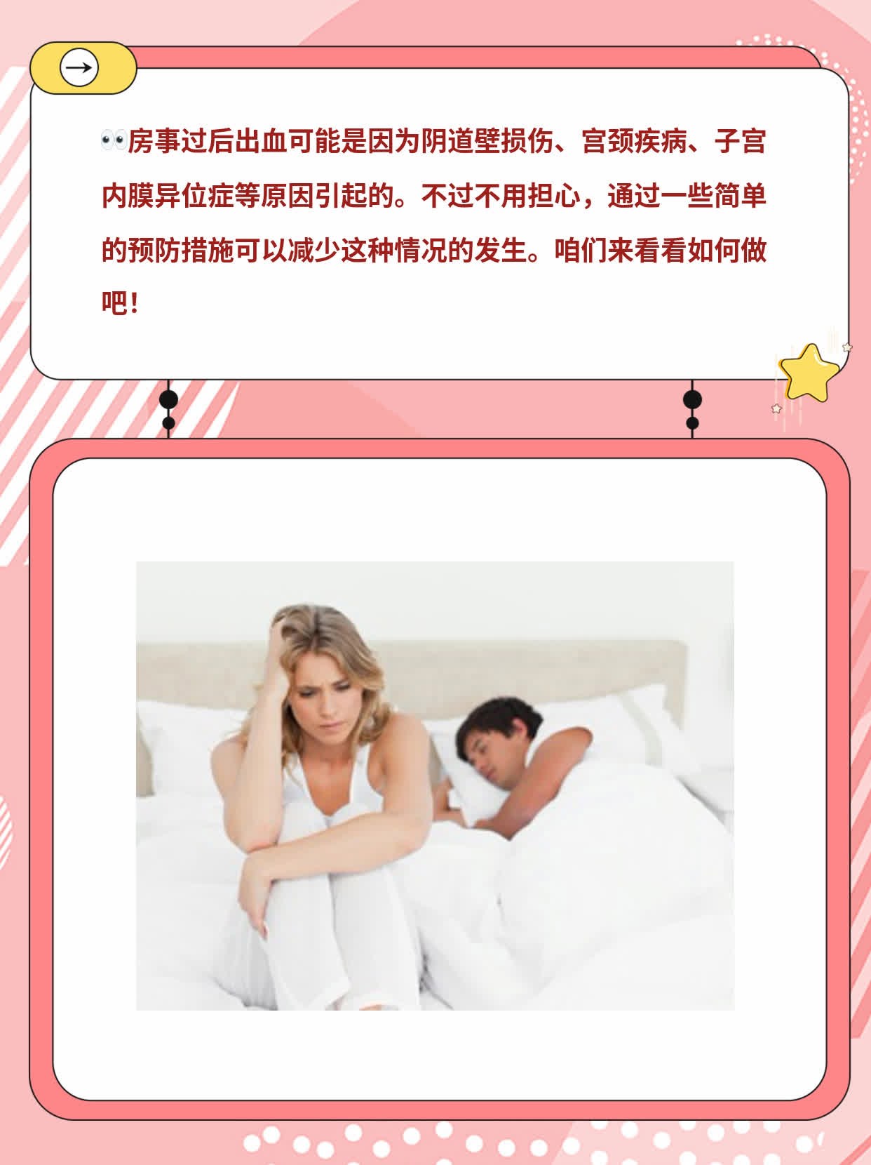 5、月经第一天同房存在多重危害,具体如下一感染风险显著增加月经期间,女性子宫内膜脱落形成创面,宫颈口微张,防御屏障减弱此时同房,男性生殖器携带的细菌病毒等病原体易侵入子宫输卵管,引发子宫内膜炎症状包括发热腹痛分泌物异味,炎症若蔓延至输卵管和盆腔,可导致盆腔炎,显著增加宫外孕;导致病情反复或加重有生育计划的女性月经期间同房增加的不孕风险需格外重视,应尽量避免在经期同房以保障生殖健康青春期女性生殖系统尚在发育中,月经期间同房对其生殖系统的不良影响更为显著,更应严格避免家长也需加强对青春期女性的健康宣教,使其了解经期同房的危害,养成良好的经期卫生习惯。