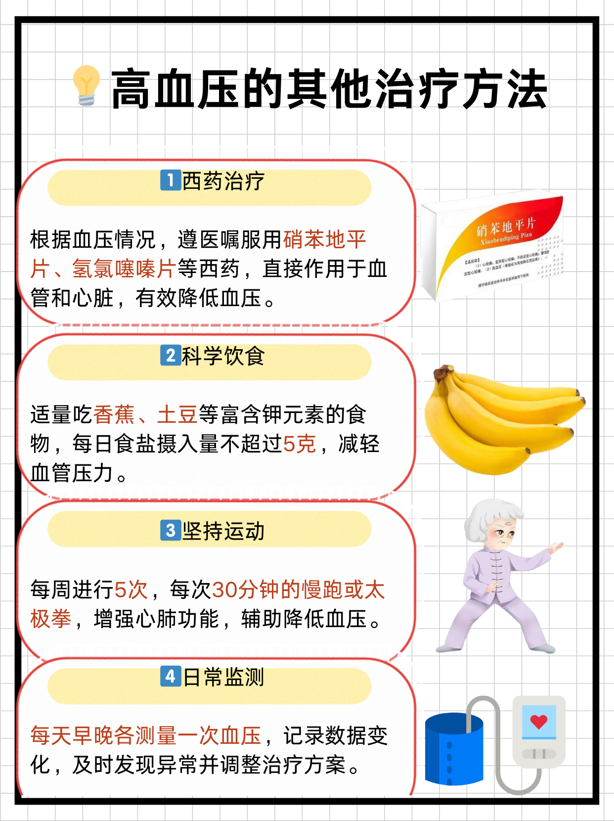 降血压的方法主要分为生活方式干预药物治疗,特殊人群需注意针对性措施,具体如下一生活方式干预1合理饮食限盐每日钠盐摄入量控制在6克以内,高盐饮食会导致水钠潴留,增加血容量,升高血压高危人群如高血压家族史超重者需严格限盐,一般人群逐步减少摄入增钾多食用香蕉土豆。