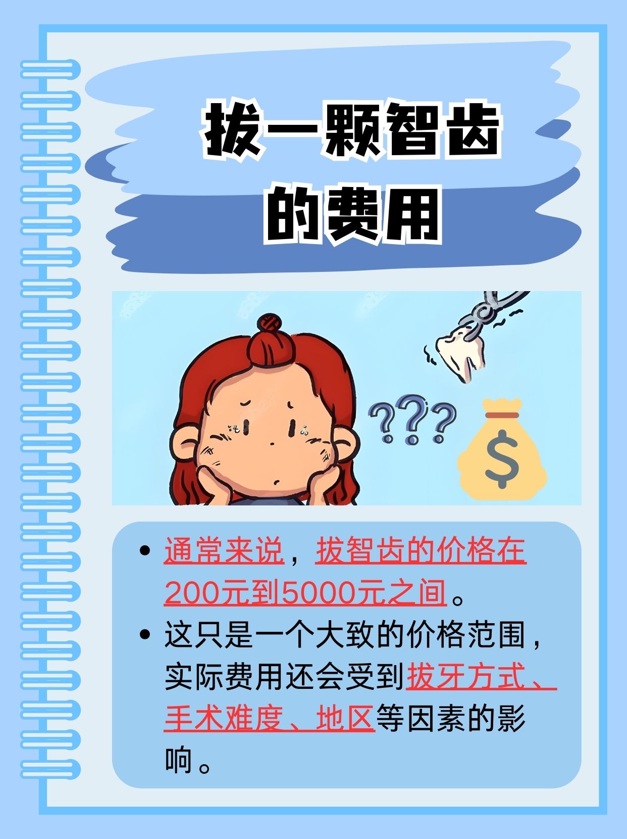 拔一颗智齿的价格是不固定的,受多种因素影响,主要包括智齿的生长位置和病人所在的地区及所选择医院的级别以下是具体的价格范围和相关因素简单智齿拔除价格约200元左右情况说明智齿完全萌出,位置相对正常,拔除较为容易复杂智齿拔除价格300元400元之间情况说明智齿生长复杂,如低位。