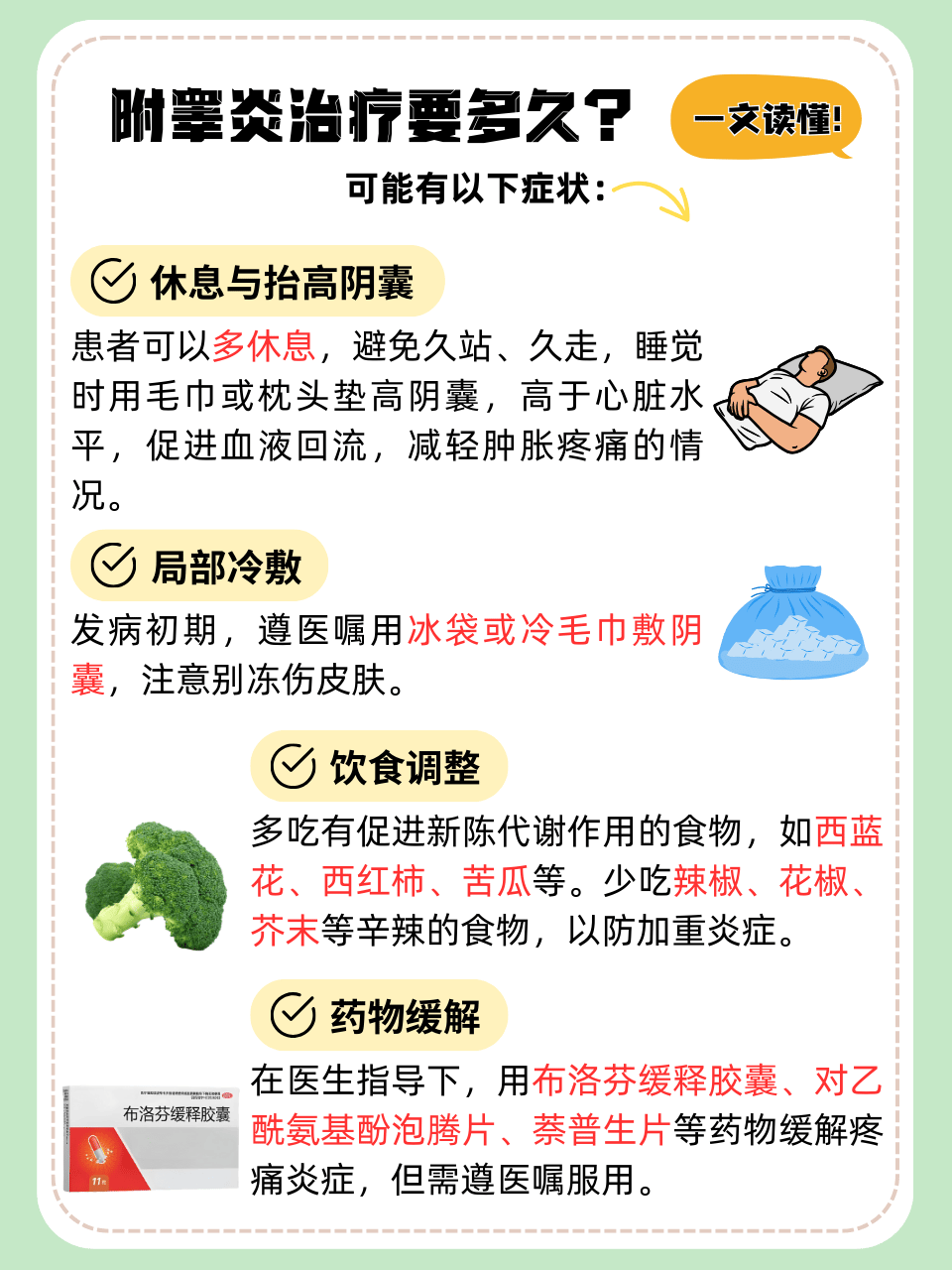 2病毒性睾丸炎若由病毒感染如腮腺炎病毒导致,需使用抗病毒药物,如利巴韦林,同时可联合干扰素调节免疫功能,辅助清除病毒需注意,抗病毒药物需在病毒感染早期使用,效果更佳二对症治疗用药 1止痛药物睾丸炎常伴剧烈疼痛,可使用非甾体类抗炎药如布洛芬阿司匹林缓解疼痛并减轻炎症。
