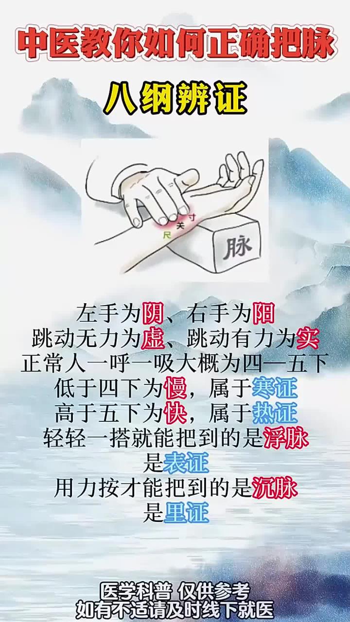 3、为什么中医把脉要把两只手呢?中医认为,左右手的ldquo寸关尺rdquo所代表的意义是不同的,左手ldquo寸关尺rdquo代表ldquo心肝肾rdquo,右手的ldquo寸关尺rdquo代表ldquo肺脾肾命门rdquo,所以中医把脉要两只手都把把脉步骤首先感觉到脉搏的位置,有的轻轻一摸就能摸到;如何学习中医把脉呢中医把脉不是说门把放到脉跳的部位就变成,除开部位恰当外,也有许多需要留意的地区,下边是号脉的八个流程一中医把脉有八个关键点 专家团队说将自身右手的无名指中拇指右手无名指闭拢放到左手手腕子后寸口的部位,觉得脉率的活动最先觉得到脉率的部位,有的轻轻地一摸就能触到,有的却需要用劲才可以触;中医通过经络理论进行诊断,其理论基础是人体的经络系统,它遍布全身,具有运行气血和反映病候的功能因此,中医的把脉诊断技术基于对经络系统和气血运行的深刻理解和长期经验经络是经脉和络脉的总称,经脉贯通上下,沟通内外,络脉则纵横交错,遍布全身中医认为,经络内属于脏腑,外络于肢节,沟通脏腑与体。