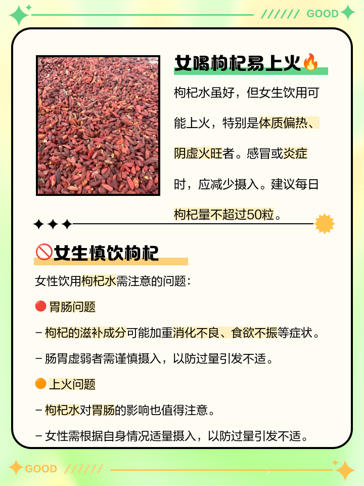 喝枸杞水有以下好处一养肝明目枸杞富含胡萝卜素维生素A及枸杞多糖等成分,能够缓解长时间用眼或熬夜导致的眼部疲劳,改善视力模糊干涩等症状其活性成分还可促进肝脏解毒功能,帮助清除代谢废物,减轻肝脏负担,对预防脂肪肝肝炎等肝损伤具有辅助作用二延缓衰老枸杞中的抗氧化物质,如枸杞多糖;6 抗衰老枸杞中的抗氧化剂有助于抵抗衰老过程,保持皮肤健康年轻7 过敏反应极少数人可能对枸杞有过敏反应,包括皮疹呼吸困难或胃部不适8 药物相互作用枸杞可能与某些药物相互作用,影响抗凝血药和糖尿病药的效果9 过量摄入过量饮用枸杞水可能导致不适,如腹泻眼睛疼痛或视力模糊;喝枸杞水有以下好处一养肝明目枸杞富含胡萝卜素维生素A及枸杞多糖等成分,能够缓解长时间用眼或熬夜导致的眼部疲劳,改善视力模糊干涩等症状其活性成分还可促进肝脏解毒功能,帮助清除代谢废物,减轻肝脏负担,对预防脂肪肝肝炎等肝损伤具有辅助作用二延缓衰老枸杞中的抗氧化物质,如枸杞多糖β胡萝;每天坚持喝枸杞水,坚持喝一个月可能会带来以下好处提升机体免疫力枸杞中含有的多糖和抗氧化物质能够增强机体的免疫功能,有助于造血功能的恢复,并增加白细胞数量,为身体提供基本的保护作用虽然短期内效果可能不明显,但长期坚持有助于提升整体健康水平延缓衰老过程枸杞的抗氧化特性有助于减少自由。