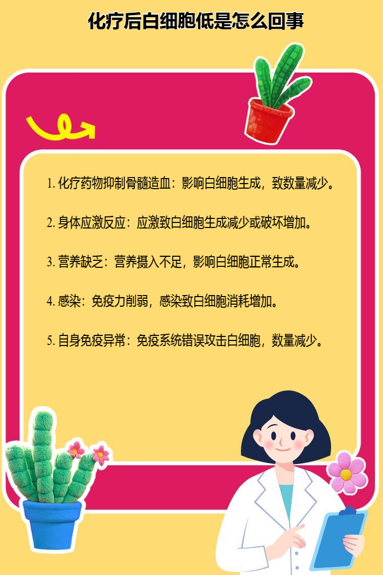 一白细胞低的原因1药物因素化疗药物抗甲状腺药物免疫抑制剂等可能抑制骨髓造血功能,导致白细胞减少2感染病毒如流感病毒肝炎病毒细菌真菌等病原体感染可能直接破坏白细胞或抑制其生成3免疫系统疾病系统性红斑狼疮类风湿关节炎等自身免疫病可能产生自身抗体,攻击并破坏白。