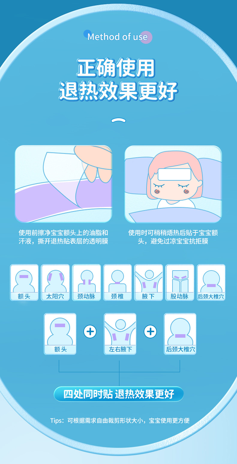 足心外阴部眼睛四周嘴部,以免引起不适4注意异常反应 使用中或使用后,如皮肤出现肿胀发炎等异常现象,应立即停止使用,并咨询医生退热贴开封后应尽快使用,以免降低冷却效果5不可依赖退热贴 退热贴仅能辅助降温,不能解决发烧的根本病因退烧需综合治疗,孕妇病情加重时应及时就医。