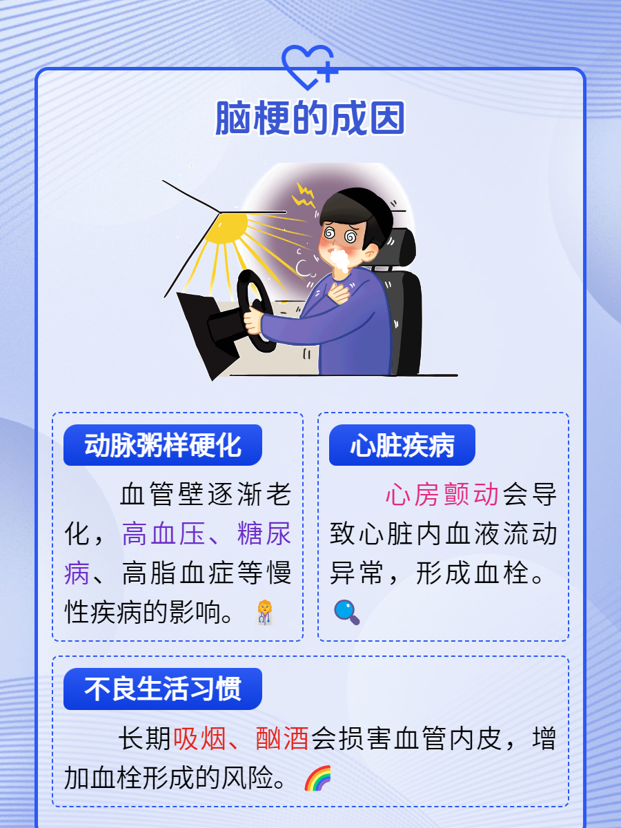 脑血栓的形成是多种因素共同作用的结果,常见原因包括以下方面1 动脉粥样硬化动脉粥样硬化是脑血栓最常见的原因血管内皮因长期损伤如高血压吸烟等后,血液中的胆固醇脂肪等物质逐渐沉积于血管壁,形成斑块这些斑块会逐渐增大,导致血管狭窄甚至完全堵塞,阻碍脑部血液供应若斑块破裂,还会触发。
