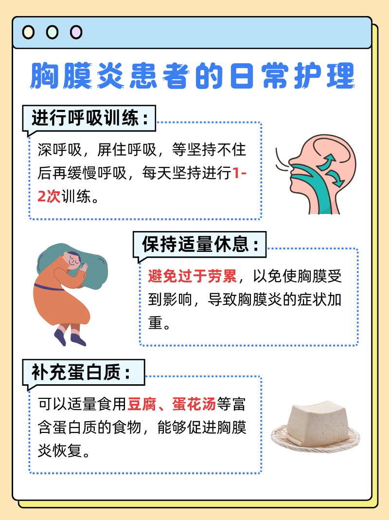 3、胸膜炎的治愈时间取决于多种因素,如病情的严重程度患者的身体状况是否伴有其他并发症以及治疗是否及时等一般来说,如果病情较轻且治疗及时,胸膜炎可能在数周至数月内得到治愈然而,对于病情较重或伴有其他并发症的患者,治愈时间可能会更长因此,无法给出一个具体的治愈时间范围二胸膜炎的;整个疗程需严格遵医嘱完成,通常为69个月,不可自行中断或减量治愈的关键在于规范治疗与全程管理患者需定期复查血常规肝肾功能及胸部影像学,监测药物副作用及疗效若出现肝功能异常过敏反应等,需及时调整方案研究表明,规范治疗下结核性胸膜炎的治愈率可达90%以上,但治疗失败或复发多与用药不;细菌感染引起的胸膜炎,使用敏感抗生素后通常24周可治愈,轻度感染可能缩短至2周,重度感染需4周以上肿瘤性胸膜炎的治愈时间与肿瘤治疗相关,若肿瘤控制良好,胸膜炎可能随治疗逐渐改善,但总体疗程难以明确,可能贯穿肿瘤治疗全程二病情严重程度的影响轻症胸膜炎如无或少量胸腔积液规范治疗12周。