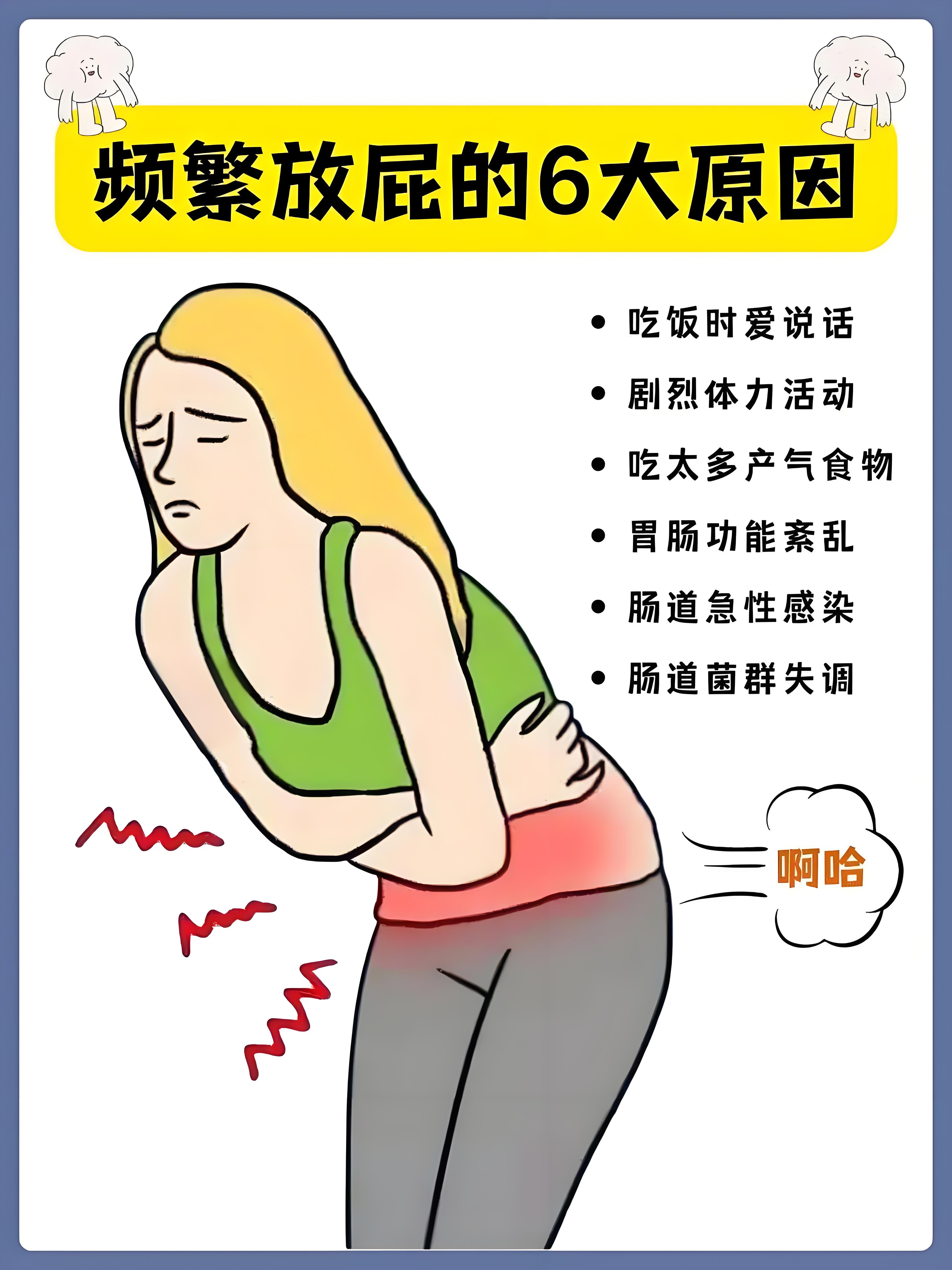 肠道菌群失调正常情况下肠道菌群保持平衡,若有害菌增多或有益菌减少,肠道内的发酵过程会异常,产生过量气体比如长期使用广谱抗生素可能破坏肠道菌群平衡,引发肠道菌群失调进而导致频繁放屁吞咽过多空气不良进食习惯吃饭过快边吃边说话,会使大量空气随食物一起进入消化道嚼口香糖抽烟等行为也会让;经常放屁的原因主要分为饮食因素消化系统疾病和其他因素三大类,具体如下一饮食因素摄入易产气食物是常见原因例如,豆类含低聚糖等难以消化的碳水化合物,经肠道细菌分解后产生氢气二氧化碳等气体十字花科蔬菜如西兰花卷心菜中的棉子糖等糖类,同样因难以消化而在肠道内发酵产气高油脂;频繁放屁可能由饮食因素消化系统疾病其他因素引起,具体如下饮食因素摄入易产气食物是常见原因豆类如黄豆黑豆含低聚糖,难以被小肠吸收,进入大肠后被细菌发酵产生气体十字花科蔬菜如西兰花卷心菜和高淀粉类食物如土豆红薯在肠道内分解时也会释放气体儿童胃肠功能较弱,过量。