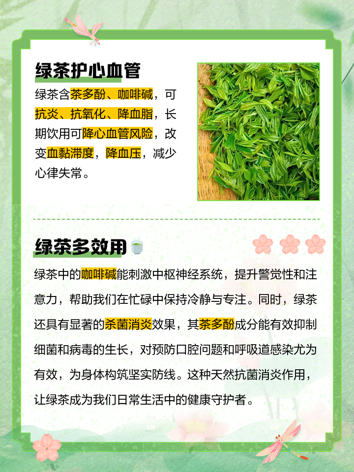 绿茶具有多种健康功效,具体作用如下1抗氧化绿茶富含茶多酚,其抗氧化能力可清除体内自由基,减少氧化应激对细胞的损伤,有助于维持细胞健康,延缓因氧化导致的组织退化2降脂减肥绿茶中的咖啡因与茶多酚协同作用,通过促进脂肪分解抑制脂肪吸收及加速代谢,减少体内脂肪堆积,尤其对腹部脂肪的。