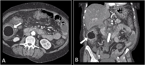 入院检查,患者呈病态面容,脸色苍白,无黄疸和发绀。生命体征显示心动过速(脉搏115次/min),低热(体温37.5℃),呼吸频率和血压均正常,室内空气中氧饱和度为99%。腹部触诊柔软,伴有弥漫性压痛,压痛在右髂窝处最为明显并伴有反跳痛。Rovsing征为阳性。初始实验室检查显示白细胞计数和炎症标志物(包括血沉和C反应蛋白)水平升高。肝、肾功能正常。