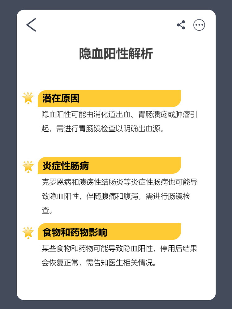 3、常见病因及解决措施如下饮食或药物干扰若近期食用动物血肝脏等含铁丰富的食物,或服用铁剂铋剂等药物,可能导致假阳性结果解决措施为暂停相关食物或药物35天后复查大便隐血试验,若结果转阴则无需特殊处理上消化道出血胃十二指肠等部位出血时,血液经胃酸作用后呈黑色或隐血阳性,常见病因。