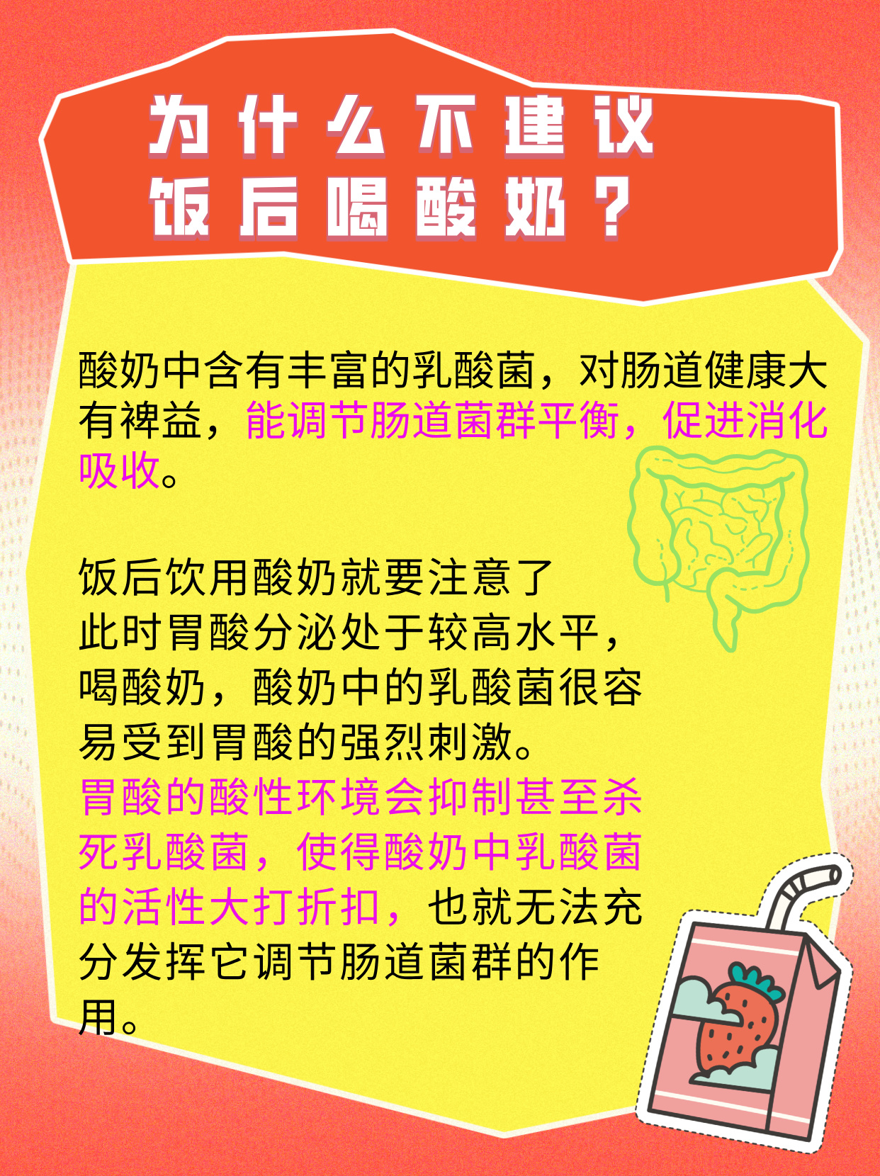 小孩子早上不可以空腹喝酸奶,原因如下温度刺激酸奶中含有乳酸菌,这种成分通常需要冷藏保存如果早晨空腹喝酸奶,可能会因为酸奶温度太低而刺激肠胃,特别是在冬天,容易引起拉肚子破坏有益菌酸奶中含有不耐酸的双歧杆菌,这种成分对人体有益,但是空腹时胃里会有很多强酸性的胃液,此时喝酸奶容易破坏。