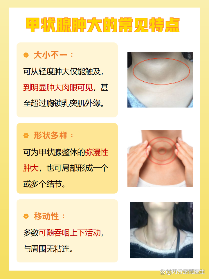 8、甲状腺肿大的消肿方法需根据病因病情及个体情况制定个性化方案,主要治疗途径如下1 病因治疗 碘缺乏若由碘摄入不足引起,需补充碘剂可通过食用含碘食物如海藻海鲜或口服碘剂纠正需注意避免过量补碘,以免诱发其他甲状腺问题自身免疫性疾病如桥本甲状腺炎,需根据甲状腺功能选择治疗甲状。