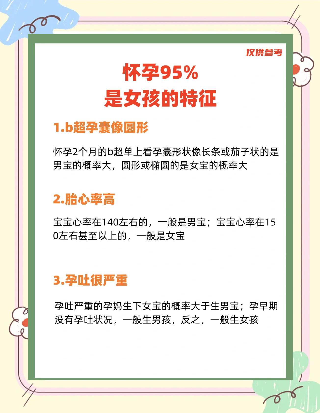 胎心较慢但频率较快通常表示怀女孩7 孕妇乳房特征怀孕后,如果左乳颜色逐渐变深,接近黑色,通常表示怀男孩反之,右乳颜色逐渐变黑,则表示怀女孩8 脉象特征中医通过把脉观察脉象的强弱来判断怀男孩还是女孩左脉旺通常表示怀男孩右脉旺则表示怀女孩。