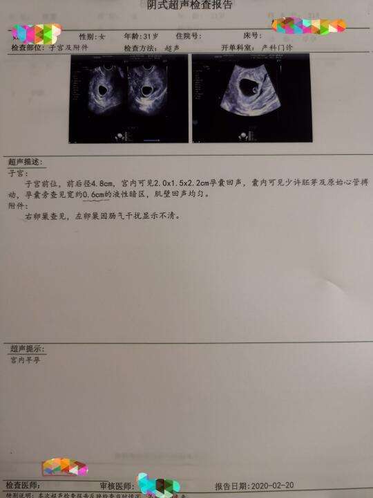 胎囊 首先看胎囊胎囊只有在怀孕早期才能够看到,怀孕一个月时胎囊直径大约二厘米,到怀孕两个半月时胎囊直径约为五厘米胎囊在子宫的宫底前壁后壁上壁中部都属正常正常情况下B超所视的胎囊形状清晰,呈圆形或椭圆形胎头 轮廓完整,人缺损或变形则为异常脑中线无移位和无脑积水为正常;需要说明的是,胎囊的形状长圆是从解剖学的角度而言如果是B超,则会产生误差,我做过试验,把一个在超市购买的肉丸子,放在剖开的鸡腹腔内,保留内部的内脏,然后用B超观察,由于B超探头位置不同,得到肉丸子的形状有圆形扁圆形甚至有弯曲的形状相对而言,做阴式B超得到的胎囊形状比较接近真实。