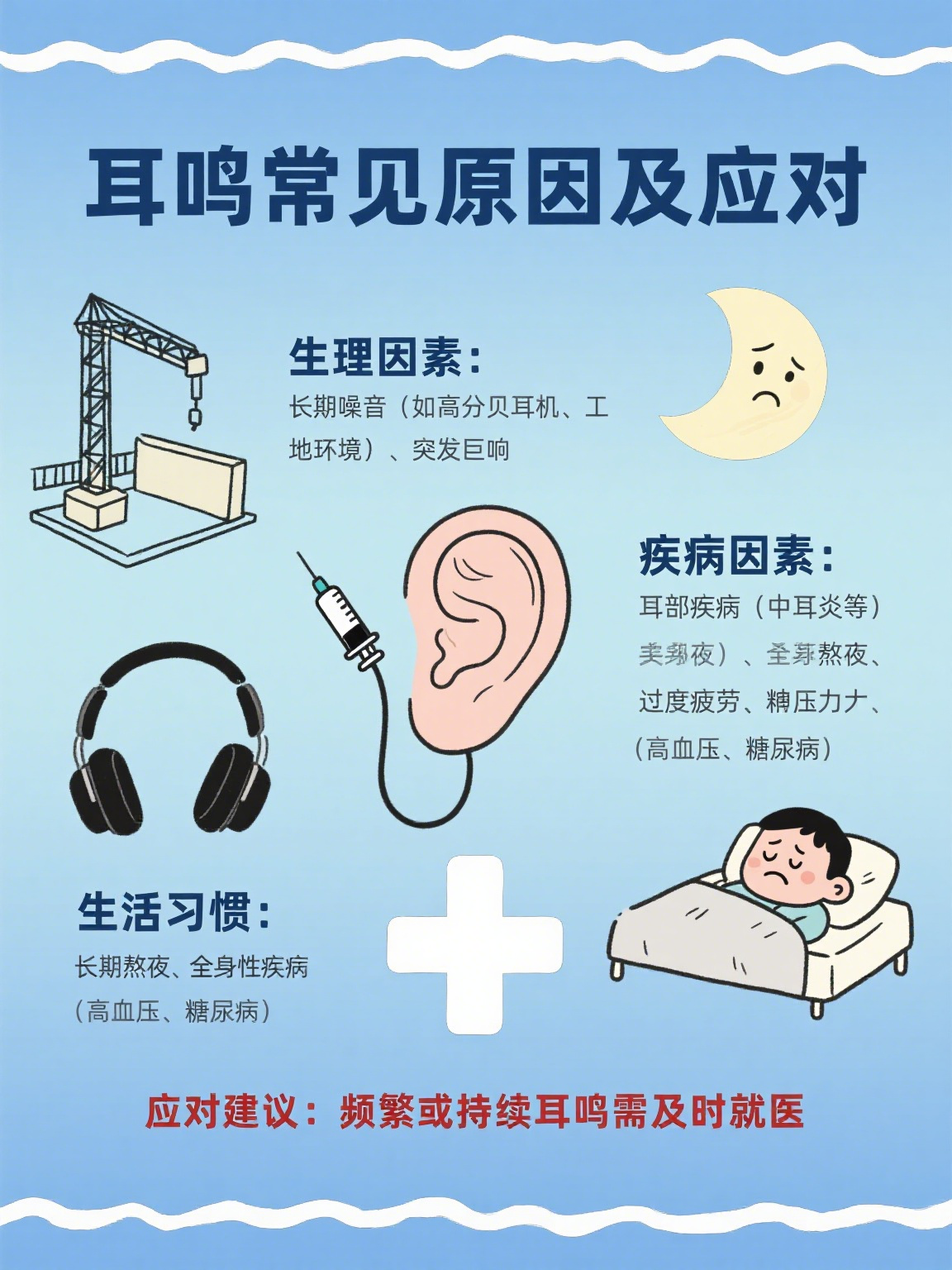 10、耳朵一直嗡嗡响耳鸣可能由以下原因引起,需结合具体症状和病史综合判断1 耳部疾病中耳炎外耳道炎鼓膜穿孔等感染或损伤,以及耳垢过多耵聍栓塞等,均可能阻塞耳道或影响内耳功能,导致耳鸣若伴随耳痛流脓听力下降等症状,需立即就医进行耳部检查,通过清理耳垢抗感染治疗或手术修复损伤解决。