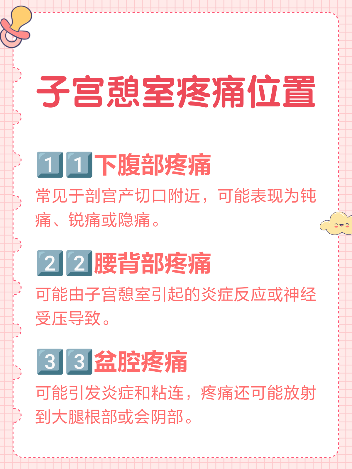 3、4 异位妊娠子宫憩室可以成为异位妊娠的导管,这是一种妊娠发生在子宫以外的地方,通常是卵巢或输卵管5 子宫内膜异位症子宫憩室可以与子宫内膜异位症相关,这是一种子宫内膜组织生长在子宫以外区域的疾病这可能导致疼痛月经异常和不孕对于子宫憩室的处理方法包括药物治疗手术修复或切除憩室;子宫切口憩室的危害主要体现在以下几个方面1月经异常子宫切口憩室会破坏子宫内膜的正常结构,导致经期延长经量增多或淋漓不尽这种异常出血可能持续数天甚至数周,严重影响女性的日常生活和工作效率长期未干预还可能引发贫血,进一步损害身体健康2不孕或流产风险增加憩室的存在会改变子宫内环境,干扰胚胎着床所需的稳。