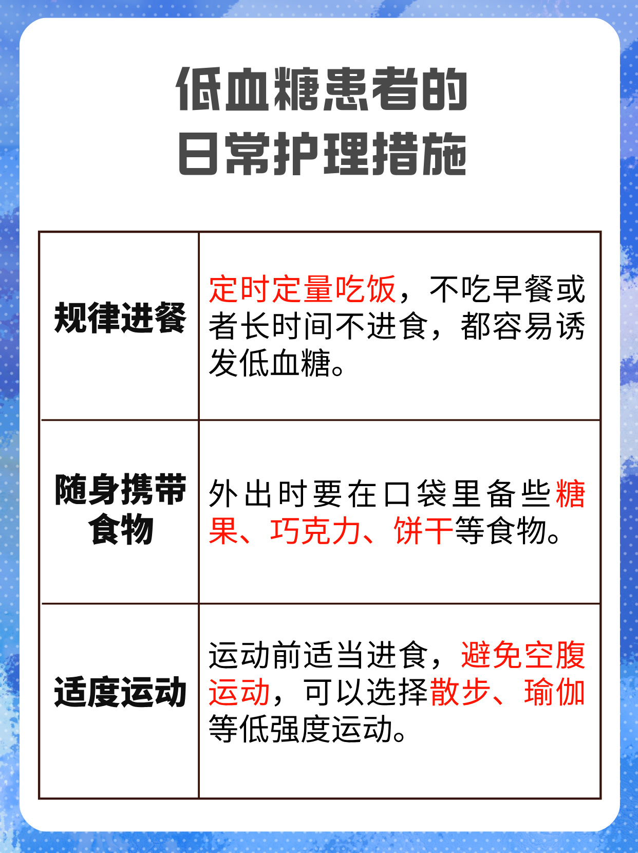 3、发生低血糖时,可按以下步骤处理一立即补充糖分发生低血糖后,需尽快摄入能快速升高血糖的食物成人可选择口服1520克糖类,如25片葡萄糖片,或饮用150200毫升果汁如苹果汁橙汁,也可食用几块方糖或半杯甜饮料如可乐儿童因身体对糖分的需求和耐受情况与成人不同,更推荐使用葡萄糖;低血糖的处理需分情况采取针对性措施,具体如下一立即补充糖分低血糖发作时,首要目标是快速提升血糖水平可优先选择快速起效的糖类,如葡萄糖片每片含葡萄糖45克含糖饮料如果汁碳酸饮料糖果或蜂蜜建议一次性摄入1520克糖分,例如34块方糖半杯果汁或1小管葡萄糖凝胶15;一立即补充糖分发生低血糖时,需尽快摄入1520克可快速吸收的单糖类食物,如34块方糖1汤匙蜂蜜或半杯果汁约150毫升此类食物中的葡萄糖或果糖可直接被肠道吸收,迅速提升血糖水平儿童患者应选择低糖分糖果,并控制摄入量以避免过量糖尿病患者需根据病情选择补充物,同时避免血糖波动过大;首选口服1520克葡萄糖如葡萄糖片或含糖量高的食物,例如半杯果汁约120ml23块方糖1勺蜂蜜,或进食糖果饼干面包馒头等补充后15分钟复测血糖,若未恢复需再次补充此阶段需避免高脂食物如巧克力,因其升糖速度较慢二药物性低血糖的特殊处理若低血糖由胰岛素磺脲类;发生低血糖时,可按以下步骤处理一立即补充碳水化合物尽快摄入1520克能快速升高血糖的碳水化合物成人可选择葡萄糖片1015克即可含糖饮料如150200毫升果汁或蜂蜜水儿童因生理特点,建议使用专用葡萄糖凝胶或糖浆,这类补充剂更易服用且起效快,可避免因吞咽困难延误治疗快速补充碳水;一轻症女性低血糖患者的应对若症状较轻且意识清醒,应立即补充能快速升高血糖的食物首选高糖液体类食物,如糖水含糖饮料或果汁,可快速被肠道吸收其次选择零食类,如糖块饼干面包等,便于携带且起效较快也可食用主食类,如米饭馒头,但吸收速度相对较慢进食后需复测血糖,确认血糖水平。