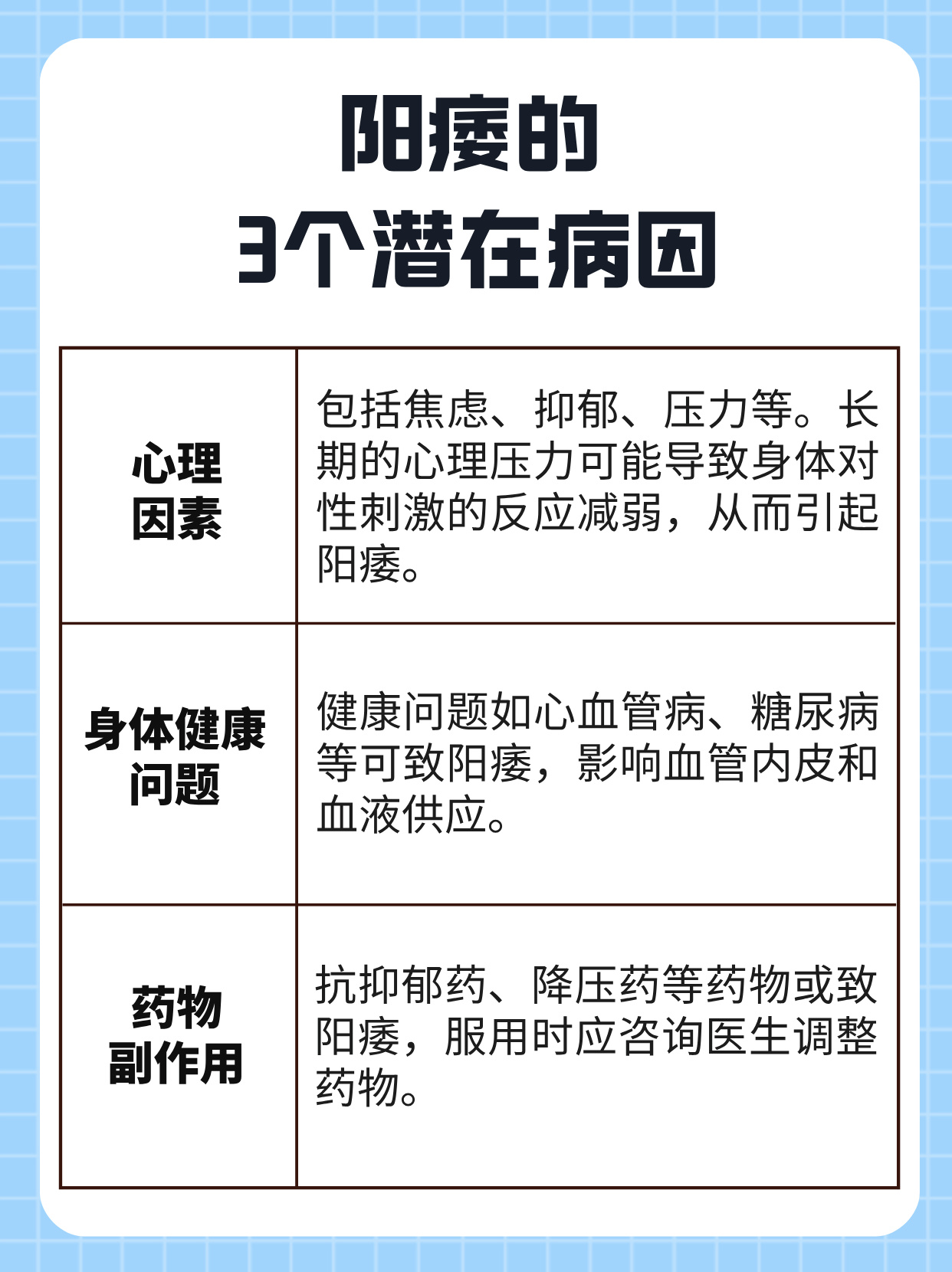 15、男性阳痿勃起功能障碍的成因复杂多样,主要包括以下方面1 心理因素长期处于高压环境如工作压力人际关系紧张经济负担可能引发焦虑抑郁或过度紧张,这些心理状态会干扰大脑对性刺激的响应,抑制勃起反射此外,过往性经历的负面记忆或对性能力的过度担忧,也可能形成心理障碍,导致功能异常2。