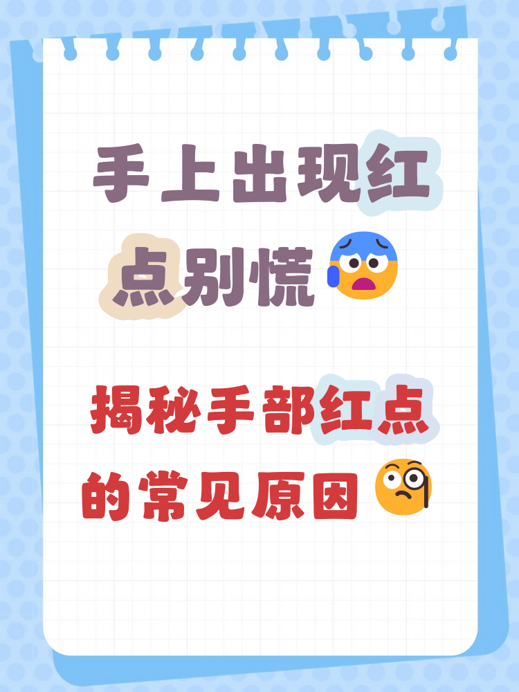 12、手上出现红点点的常见原因及处理建议如下1 湿疹湿疹是皮肤炎症反应的一种,可能与遗传环境刺激或免疫异常有关典型表现为手部出现红色丘疹或斑块,常伴有剧烈瘙痒,抓挠后可能渗出液体或形成结痂湿疹易反复发作,需通过皮肤科检查确诊,治疗以抗炎止痒为主,常用药物包括外用糖皮质激素或免疫调节。