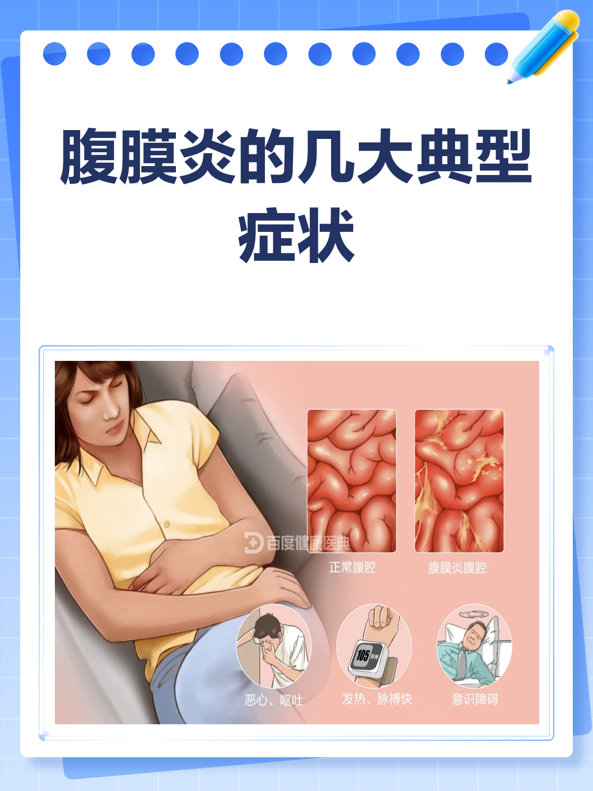 3、一感染来源原发性腹膜炎的病原菌通过血行淋巴途径或女性生殖系统直接侵入腹腔,腹腔内无明确原发病灶而继发性腹膜炎由腹腔内已存在的病变如脏器穿孔外伤或炎症引发,存在明确的原发病灶,例如胃肠道穿孔后消化液泄漏导致的感染二常见人群原发性腹膜炎多见于儿童肝硬化腹水患者肾病患者;2 明显压痛炎症刺激腹膜表面神经末梢,导致腹部局部或广泛区域出现触压痛压痛范围与炎症程度相关,继发性腹膜炎如脏器穿孔缺血通常压痛更剧烈且定位明确,而原发性腹膜炎压痛可能较分散3 反跳痛检查者按压腹部后突然抬手,患者因腹膜受牵拉引发短暂剧痛,称为反跳痛这一体征反映腹膜对刺激的;针对继发性腹膜炎常由腹腔内炎症穿孔或创伤引起,需优先处理原发病灶轻度患者可先尝试非手术治疗,若症状持续加重或出现腹肌紧张发热等中度表现,需及时转为手术治疗手术方式包括穿孔修补术封闭破裂部位,或病灶切除术彻底清除感染源术后需继续抗感染治疗,并加强营养支持以促进组织修复病情严重。