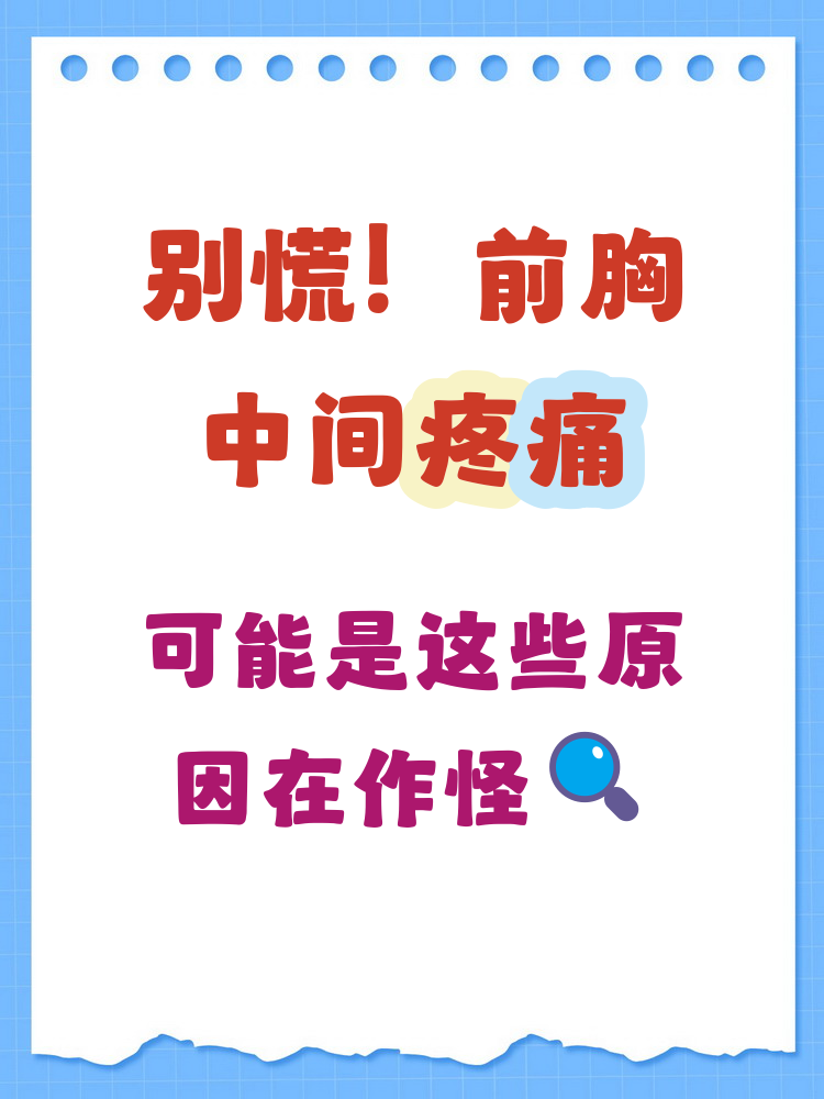 前胸中间骨头疼可能与以下原因有关,需结合症状和医学检查综合判断1肋软骨炎肋软骨炎是前胸中间骨头疼痛的常见原因,表现为局部压痛,咳嗽深呼吸或按压时疼痛加重多因病毒感染免疫异常或局部劳损引发,属于非化脓性炎症,通常无红肿表现2胸膜炎胸膜炎症可能累及前胸区域,导致疼痛,常伴咳嗽;前胸疼痛可能由多种原因引起,需结合具体症状和检查综合判断胸壁疾病若前胸疼痛部位存在局部压痛,可能与胸壁组织损伤或炎症相关,例如肋软骨炎肋骨骨折或胸壁肌肉拉伤这类疼痛通常定位明确,按压时疼痛加剧,活动或咳嗽可能加重症状呼吸系统疾病若疼痛与呼吸动作相关如深吸气咳嗽时加重,需。