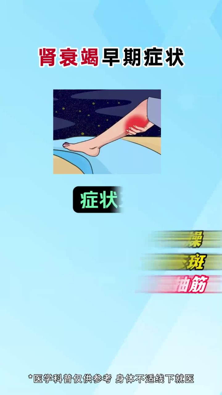 6、慢性肾衰竭的早期常见症状主要包括以下几点乏力与疲劳由于肾功能下降,身体无法充分利用氧气和营养物质,导致肌肉疲劳和全身乏力肾脏无法有效地排除体内的废物和毒素,导致身体新陈代谢异常,从而加重疲劳感贫血也是导致乏力与疲劳的常见原因,肾衰竭时红细胞的生成会减少食欲不振与消化不良毒素堆积。