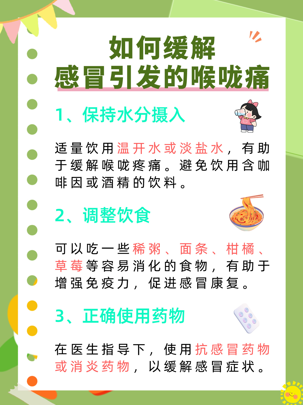 感冒前兆出现喉咙痛时,可通过以下措施缓解并预防感冒发展1及时补充水分与营养增加饮水量,每日至少饮用15002000毫升温水或淡盐水,保持咽喉黏膜湿润,缓解干燥疼痛同时多摄入富含维生素C的水果如橙子猕猴桃和蔬菜如菠菜西兰花,增强免疫力,辅助炎症消退避免辛辣过烫或过冷食物刺激咽喉。