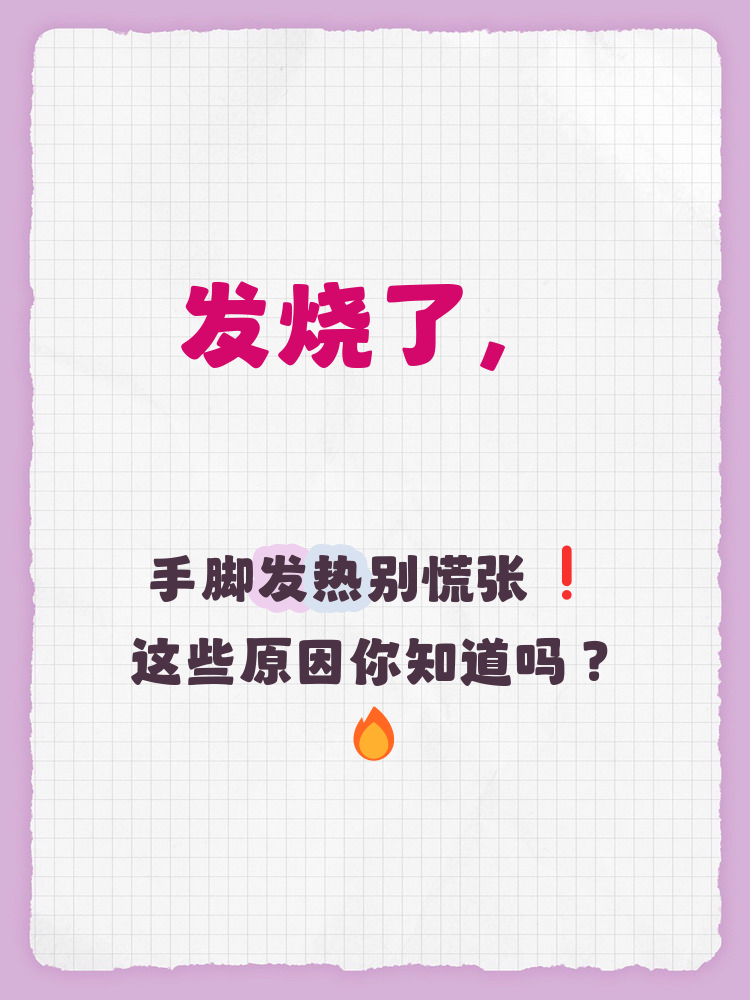 3、手脚发热可能由以下原因引起一生理性因素1情绪激动或剧烈运动当人体处于情绪激动状态或进行剧烈运动时,交感神经兴奋性增强,导致血液循环加速,末梢血管扩张,进而引发手脚发热这是正常的生理反应,通常无需特殊处理,休息或平复情绪后可缓解二内分泌与神经调节异常1内分泌失调长期熬夜。
