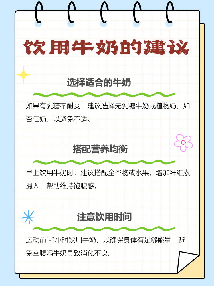 早上喝牛奶有以下好处1 提供全面营养牛奶富含优质蛋白质钙维生素D磷及B族维生素等营养成分其中,蛋白质是构成人体组织的基础物质,能为上午的活动提供持续能量钙与维生素D协同作用,可促进钙的吸收,满足骨骼牙齿及神经系统的营养需求2 增强骨骼健康牛奶中的钙是维持骨骼密度和强度的关键;早上喝牛奶的好处1 补充营养 牛奶富含优质蛋白质脂肪维生素和矿物质等多种营养成分早上喝牛奶,能有效补充身体在夜晚流失的营养,为一天的活动提供充足的能量2 促进骨骼健康 牛奶富含钙质,是骨骼健康的重要保证早上喝牛奶有助于补充钙质,增强骨骼的强度和韧性,预防骨质疏松等骨骼疾病3;早上空腹喝牛奶有一定好处,但需根据个人体质和健康状况选择,具体如下一空腹喝牛奶的主要益处 补充营养与能量牛奶富含蛋白质脂肪碳水化合物维生素如维生素B族维生素D和矿物质如钙磷镁,可为身体提供基础营养,维持正常生理功能其中,蛋白质是构成肌肉和组织的原料,碳水化合物可。