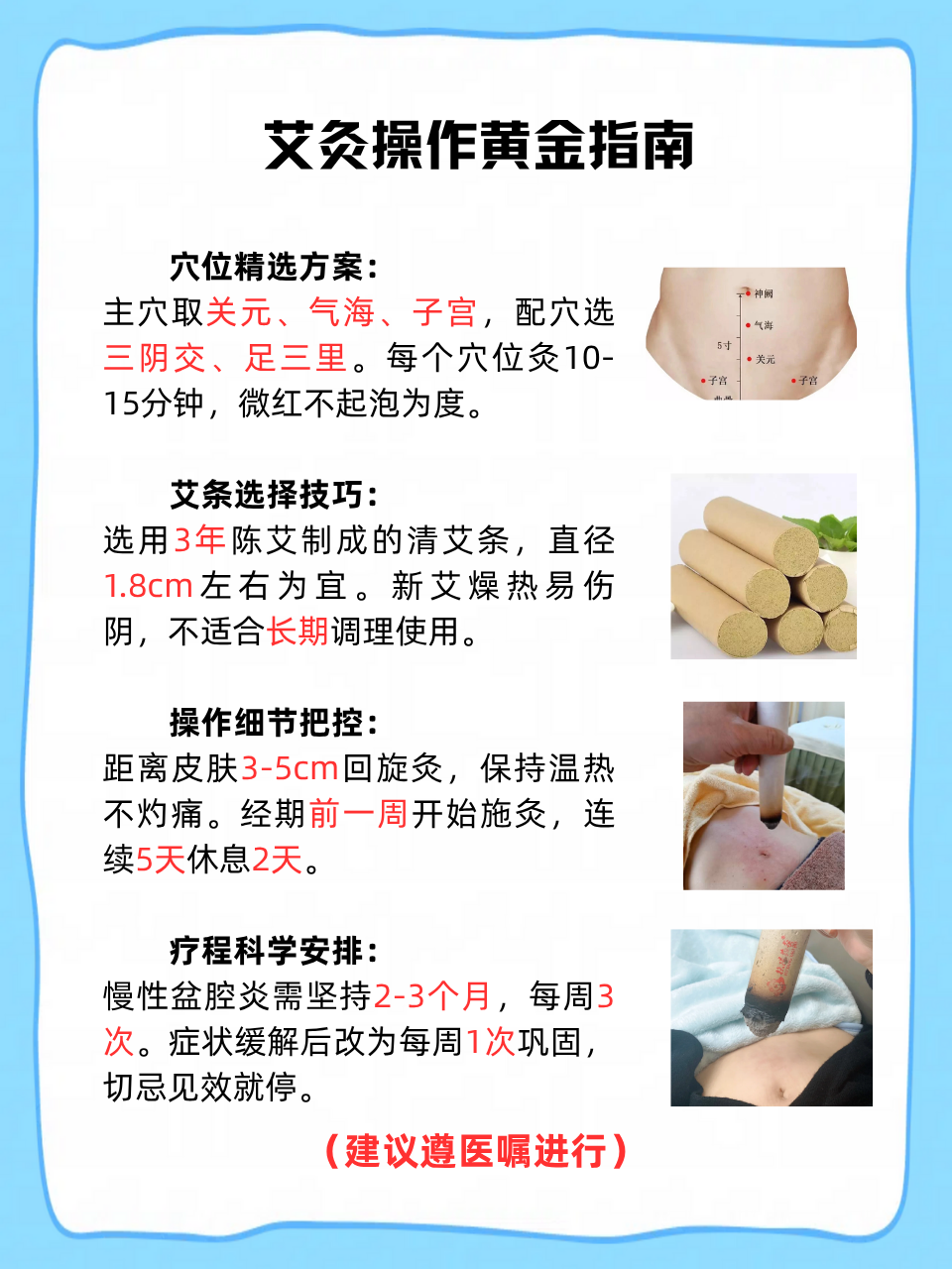 艾灸通过刺激特定穴位调节气血与温通经络来改善妇科病症状,具体治疗方式如下一艾灸穴位的选择艾灸治疗妇科病的核心在于刺激与女性生殖系统相关的穴位,常用穴位包括关元气海子宫归来三阴交等关元穴位于脐下三寸,是任脉要穴,可培补元气调理冲任,对月经失调痛经等有改善作用气海穴位于。
