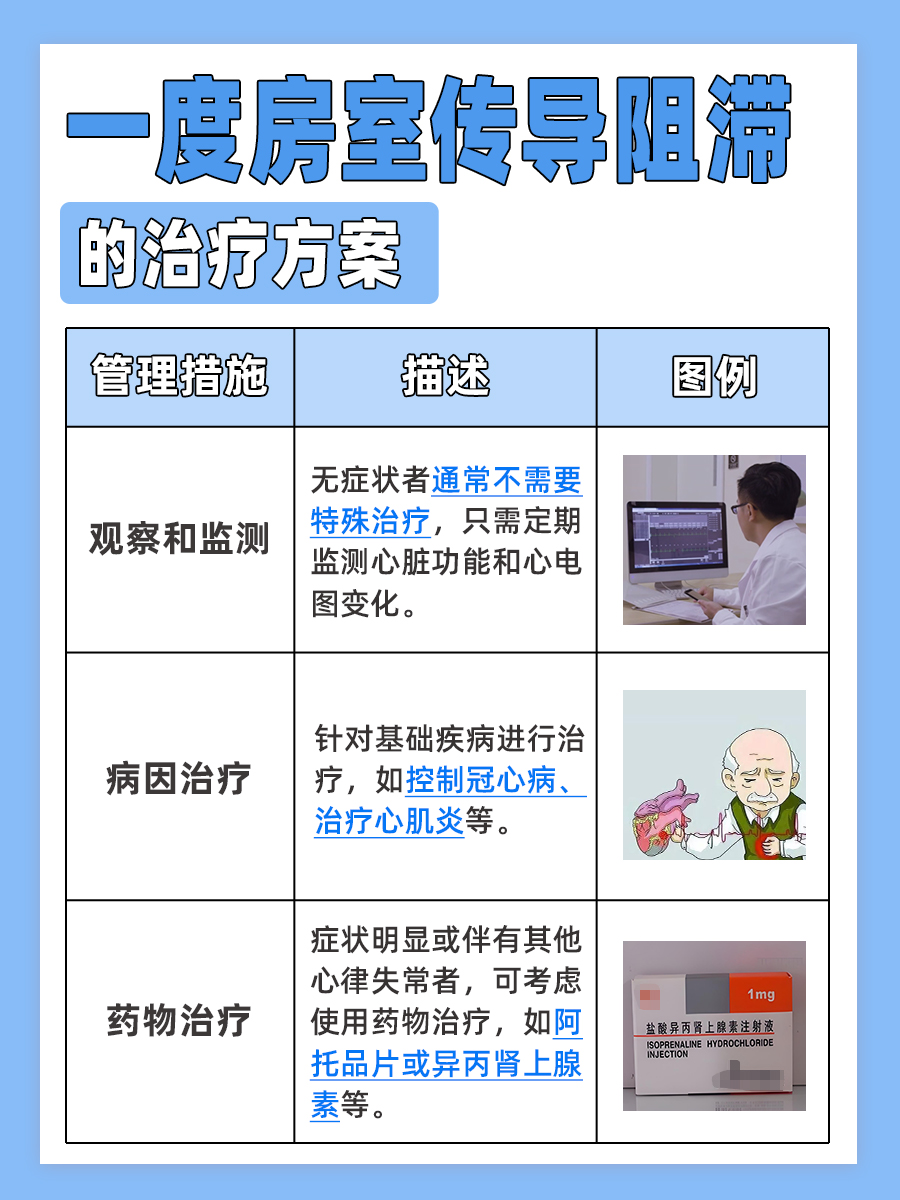 二度一型房室传导阻滞的治疗需根据患者具体情况制定个性化方案,核心原则包括改善生活方式药物治疗特殊情况处理及特殊人群管理一般治疗以改善生活方式和定期监测为主患者需规律作息,保证充足睡眠,避免熬夜与过度劳累饮食遵循低盐低脂低糖原则,多摄入新鲜蔬果以补充维生素和膳食纤维,同时戒烟限;1剧烈运动引发者此类情况多见于运动员或体力劳动者,因运动时迷走神经张力增高导致传导阻滞,常在安静或睡眠时出现通常无需特殊治疗,但需注意运动后充分休息,避免剧烈运动以防止病情加重日常应保持规律作息,减少心脏负荷2病毒性心肌炎引发者炎性物质刺激心肌组织导致传导功能异常,需通过抗病毒治疗;二度房室传导阻滞一型的治疗需根据病情和患者特点综合施策,具体如下一一般治疗1病因治疗需明确病因并针对原发疾病治疗例如,急性心肌梗死患者需改善心肌供血,心肌炎患者需抗炎治疗儿童患者需排查先天性心脏发育异常或感染性疾病,中老年患者需警惕冠心病等心血管疾病2休息与生活方式调整。
