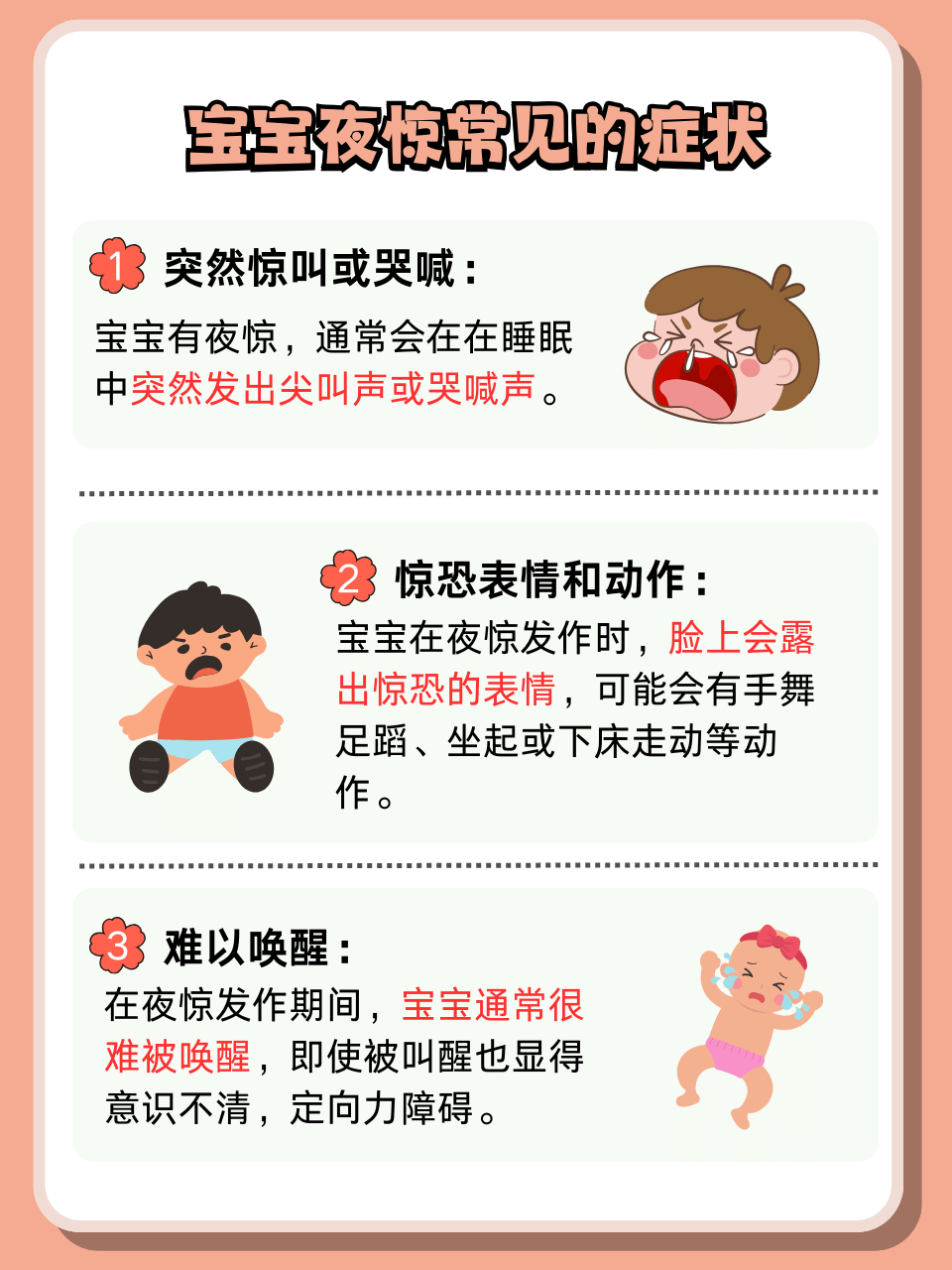 4、若宝宝情绪激烈,可尝试将宝宝抱在怀中轻轻摇晃,增强安抚效果科学依据亲人的声音和触觉刺激能激活宝宝的依恋系统,降低皮质醇压力激素水平2 转移注意力核心原理通过改变环境或姿势,打断宝宝的恐惧记忆具体操作姿势调整将宝宝脸朝下趴在你的手臂上飞机抱,或轻轻转动宝宝身体,使其;婴儿受惊吓后往往啼哭不止,这时要轻轻抚抱,或抚抱后轻轻走动,常可使之安静或渐渐入眠尽可能的做到以下几点1,休息房间要尽量保持安静,不要在嘈杂的地方2,家人对宝宝说话不要突大突小,尽量以平和亲切的语气3,可以经常抱抱拍拍宝宝,用微笑的眼神多跟宝宝说话 4,新生婴儿有肌肤之渴;宝宝易惊吓哭闹时,可通过给予安全感转移环境耳部按摩身体抚触绿茶敷脐及宝妈调节情绪等方式缓解给予安全感宝宝突然受惊吓哭闹时,宝妈应立即将其抱在怀中,轻轻拍抚并轻声说话,让宝宝感知到妈妈在身边,从而获得安全感转移环境可将宝宝放入摇篮轻晃,或用推车带其外出接触外界环境,如与;当婴儿受到惊吓时,宝妈可以采取以下三个方法进行安抚第一时间进行肢体安抚拍拍摸摸婴儿宝妈可以轻拍或轻摸婴儿的身体,如小手或小脸,给予宝宝触觉上的安慰轻轻摇晃可以轻轻地摇摇婴儿的身体或小手,让婴儿感受到宝妈在保护他,减轻恐惧感用语言进行交流语言安慰虽然婴儿可能不能完全理解;宝宝受到惊吓时,家长可采取以下措施科学应对1 给予安全感用轻柔稳定的声音安慰宝宝,如“妈妈在这里,不用怕”,通过语言传递安全感同时,通过拥抱轻拍背部或抚摸手臂等肢体接触,让宝宝感受到身体被保护的温暖避免突然的肢体动作或大声说话,以免加重紧张情绪2 创造安静环境立即关闭电视;第三,适度地拥抱和安抚,可以使婴儿有一种安全感,但在抱的时候不要你心疼孩子而晃得太厉害,这样反而会让他觉得事情更加可怕,哭得更加厉害我们要轻轻的抱着并在后背安抚着并小声对他说话分散他的注意力 第四,如果受惊吓的因素还在要带他离开受惊吓的环境,或捂着他的耳朵或放音乐来掩盖惊吓;给予宝宝合理的膳食,良好的营养不仅给宝宝带来健康的身体,减少疾病,也意味着给予宝宝智力社交心理上的良好发展#xF469#x200D#xF466语言和抚触安慰常用安抚受惊宝宝的方法语言和抚触安慰宝宝一受到惊吓,妈妈立刻用轻柔的声音安慰宝宝,同时进行肌肤的触摸,如用手顺着宝宝头发轻抚或者轻拍背部亲人的声音和肢体接触能很快让。
