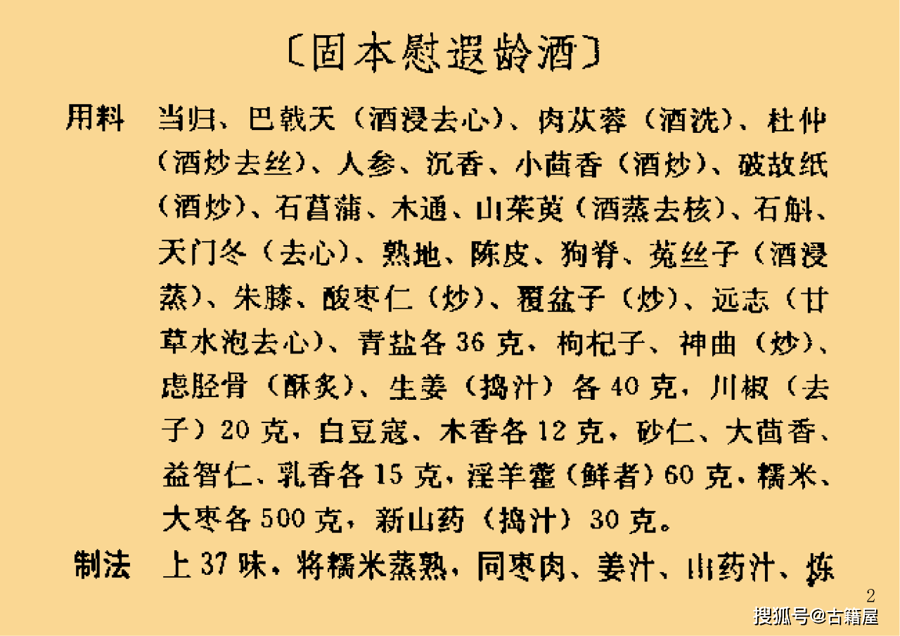 2、常用中医药方及适应症 金锁固精丸由沙苑蒺藜芡实莲须龙骨牡蛎等药物组成,具有补肾涩精的功效,适用于肾虚不固型早泄,症见腰膝酸软遗精滑泄神疲乏力等知柏地黄丸由知母黄柏熟地黄山茱萸牡丹皮山药茯苓泽泻等药物组成,具有滋阴降火的功效,适用于阴虚火旺型早泄,症见潮;补肾壮筋汤用方经验主要包括以下几点方剂选择在治疗腰痛伴右下肢放射性疼痛的患者时,若辩证为年老肾虚,寒湿痹阻,可选择补肾壮筋汤合止痉散加减进行治疗补肾壮筋汤具有补肾活血祛风除痹的功效,适用于此类病症药物组成补肾壮筋汤的基本药物组成包括熟地山茱萸当归续断青皮白芍;3饮用剂量需严格控制饮用量,每日不超过1020毫升,过量饮用可能导致上火口干等不良反应4禁忌与咨询孕妇哺乳期女性肝肾功能不全者及慢性病患者禁用具体药方需根据个人体质和病情,在中医师指导下使用,避免自行搭配重点提示补肾壮阳药酒并非人人适用,需结合体质辨证施治若出现不适。