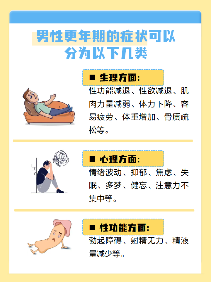 然而,有一部分男性无法适应这种变化,可能会出现一些症状,如神经质神经过敏易疲劳易怒激动抑郁头痛背痛昏眩颜面发热心悸感觉异常记忆力减退精神不易集中性功能减退等男性更年期出现上述症状时,可以通过服用镇静安眠止痛药物进行缓解,如利眠宁奋乃静去痛片谷维素等必要时,可。